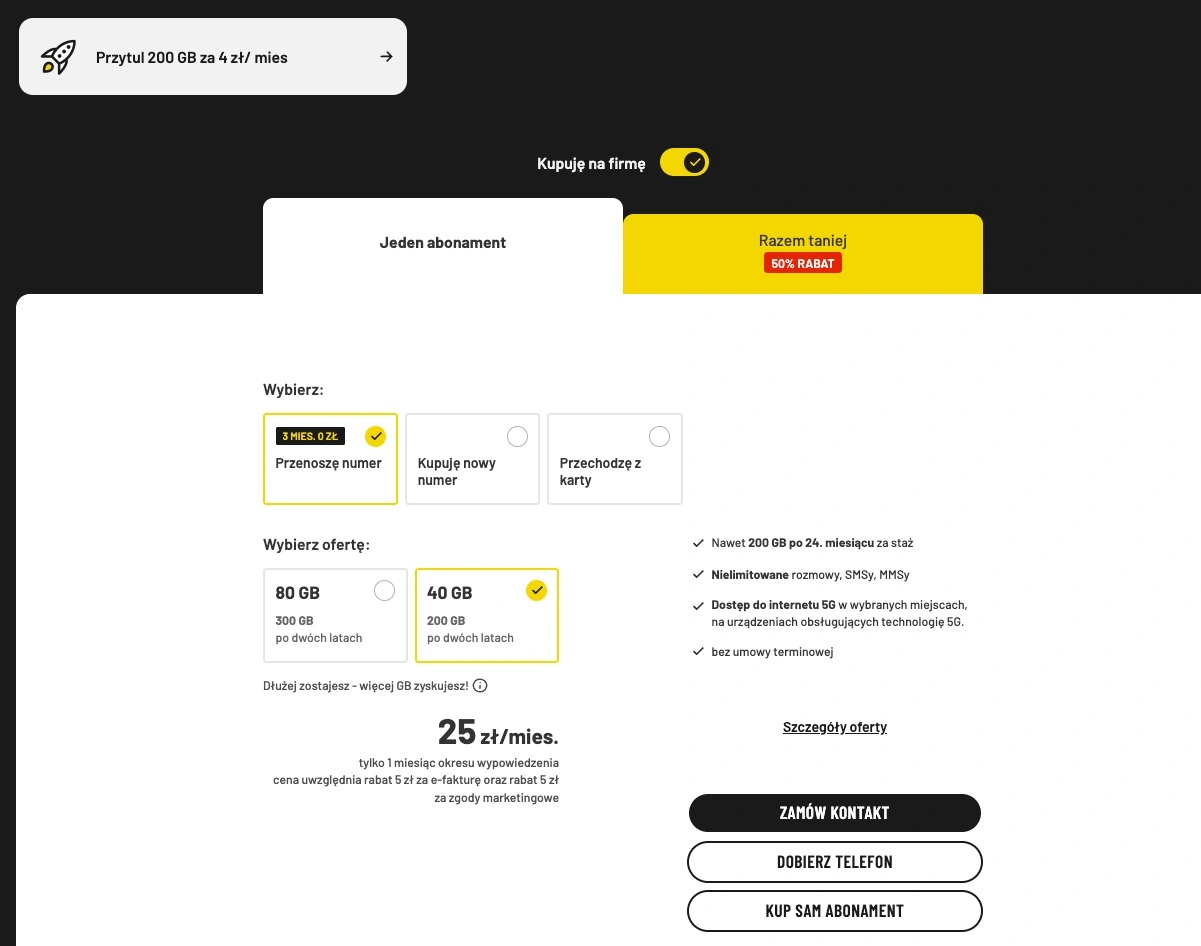 - za 25 zł/mies. z paczką internetu 40 GB na początek, 80 GB po pół roku, 160 GB po roku i 200 GB po dwóch latach z 7,25 GB w roamingu UE;