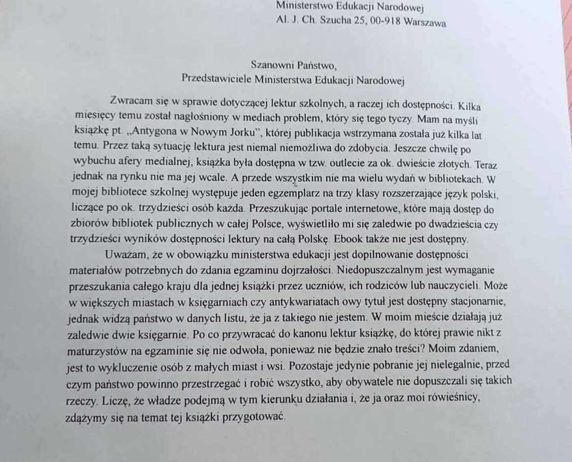 Marta wzięła sprawy w swoje ręce i wystosowała do Ministerstwa Edukacji oficjalny list, opisując problem z dostępnością "Antygony w Nowym Jorku" i prosząc o podjęcie działań, które zmierzałyby ku zmianie kanonu lektur lub po prostu w jakiś sposób wpłynięcia na podaż książki - choćby finansując dodruk i dystrybucję kopii do bibliotek szkolnych. - Gdy moja pani od polskiego na początku roku zaczęła informować całą klasę, że będzie trudno z tą książką, coś mnie tchnęło i pomyślałam, że trzeba coś z tym zrobić. Zdecydowałam napisać list - mówiła nastolatka.