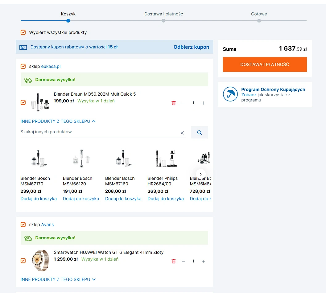 Przykład? Proszę bardzo: załóżmy, że chcesz kupić nową torbę na laptopa, blender ręczny oraz smartwatch. Zwykle tak szeroki zakres zakupów wymaga zakładania kont na trzech różnych platformach. Dzięki Kup Teraz wszystko możesz dodać do jednego koszyka, zapłacić raz i mieć pewność, że wszystko zostanie dostarczone bezproblemowo.