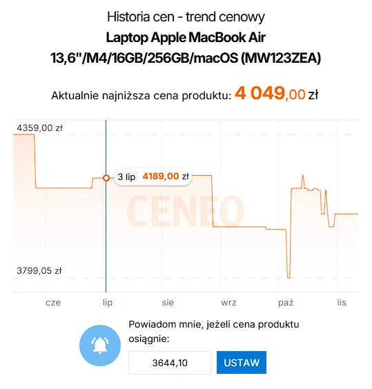 Jak to zrobić? Na Ceneo dostępna jest opcja Historia cen - trend cenowy, która pokazuje, ile dany produkt kosztował w ostatnich tygodniach i miesiącach. Dzięki temu od razu zobaczysz, czy obniżka jest rzeczywista. Przykład? Apple MacBook Air 13,6"M4 to model, którego cena w ostatnich miesiącach potrafiła się wahać - należy być ostrożnym widząc promocje.