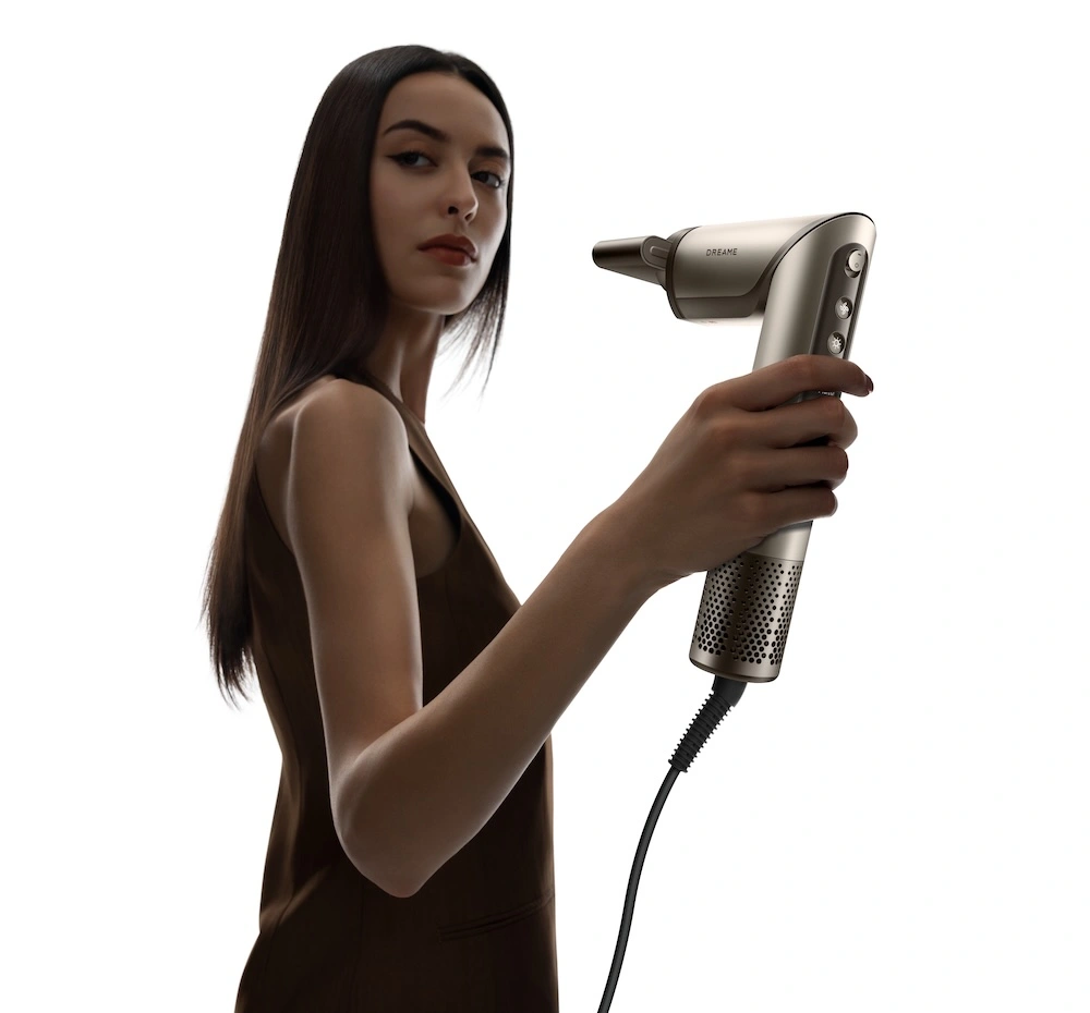 Dreame Dazzle to kosmicznie wyglądająca suszarka do włosów. Dzięki pięciu rodzajom nasadek jej rola nie ogranicza się wyłącznie do suszenia. Pełni ona również funkcję lokówki. Sprzęt rozpoznaje podłączone akcesoria i na tej podstawie dobiera zarówno temperaturę pracy jak i siłę nawiewu. W trybie stylizacji Dazzle na przemian zmienia temperaturę z ciepłej na zimną. Producent chwali się, że suszarka generuje 300 mln jonów ujemnych na centymetr sześcienny, co przekłada się na to, że włosy nie są naelektryzowane, łatwo je wygładzić i nadać im blask.