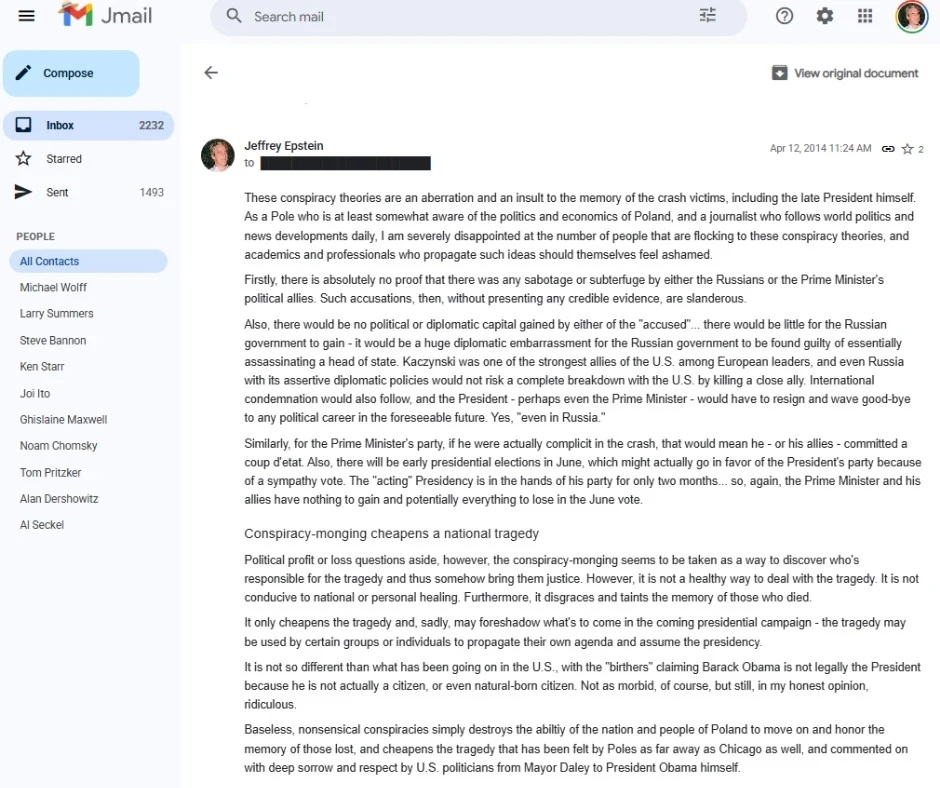 W wiadomości czytamy argumentację wykluczającą zamach, a także ostrzeżenie, że szerzenie teorii spiskowych tanio sprzedaje narodową tragedię. Fakt, że tak szczegółowa analiza polskiej polityki i nastrojów społecznych trafiła do skrzynki Epsteina, pokazuje, jak szerokie i nietypowe były jego zainteresowania geopolityczne. Finansista nie tylko obracał się w kręgach celebrytów, ale otrzymywał też raporty dotyczące kluczowych wydarzeń w Europie Środkowej.