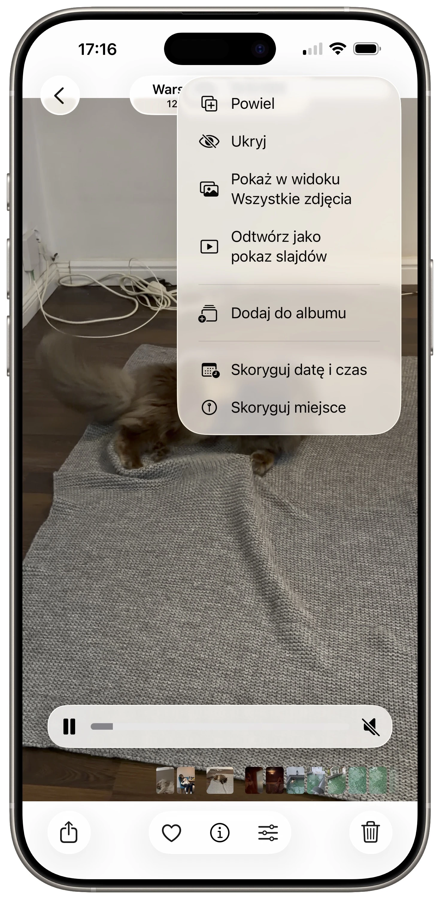 Tyle dobrego, że aplikacja Zdjęcia pozwala na ręczną edycję danych dotyczących zarówno lokalizacji, jak i daty zarejestrowania materiałów. Jeśli zależy nam na tym, aby zmniejszone pliki wideo wyświetlały się w galerii w odpowiednim miejscu na osi czasu, czeka nas po prostu trochę ręcznego klikania. W tym celu należy wyświetlić każdy nowy plik, kliknąć w prawym górnym rogu trzy kropki oraz użyć opcji „Skoryguj datę i czas” i „Skoryguj miejsce”.