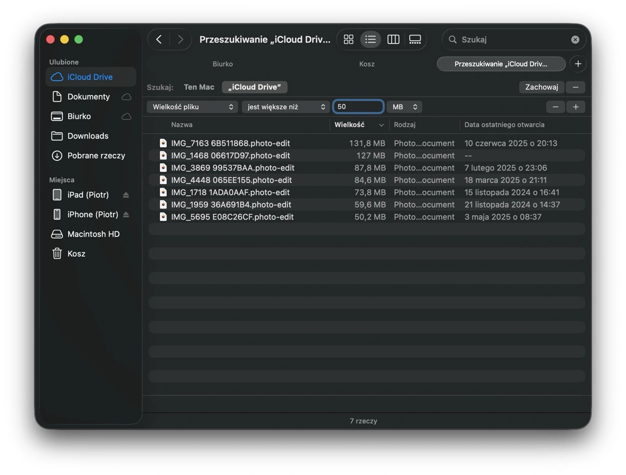 Firma z Cupertino nie utrudnia znajdowania tych największych plików w iCloud. Jeśli tylko mamy dostęp do komputera Mac, możemy odszukać je ręcznie w Finderze, nawet jeśli nie są obecnie przechowywane lokalnie na dysku - metadane dotyczące ich rozmiaru i tak są dostępne. Wystarczy uruchomić wyszukiwarkę w folderze iCloud Drive, dodać filtr na rozmiar pojedynczego pliku (od np. 50 MB w górę), ustawić sortowanie od największych i usunąć te, których nie potrzebujemy.