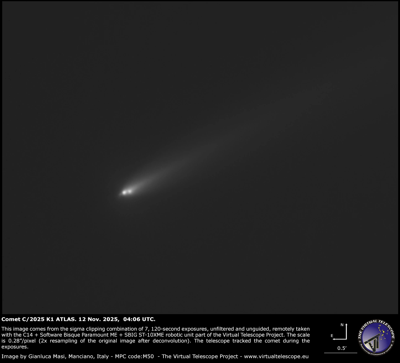 Główna ilustracja: Kometa 3I/Atlas na zdjęciach z 11 listopada. Fot. Gianluca Masi, Manciano, Italy, Virtual Telescope Project