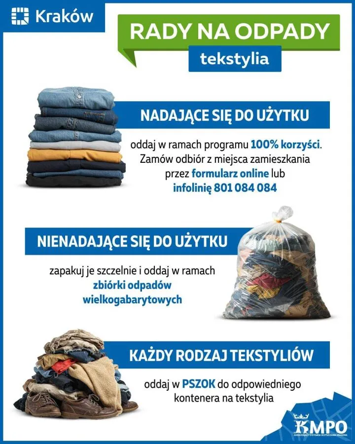 Mieszkańcy mogą oddawać tekstylia na trzy sposoby. To nie tylko PSZOK-i, ale też program "100 proc. korzyści" organizowany we współpracy z PCK. Odzież nadająca się do ponownego użycia jest bezpłatnie odbierana z domów po zgłoszeniu telefonicznym lub online. Do tego dochodzi zbiórka odpadów wielkogabarytowych. Zapakowane w worki zniszczone tekstylia (np. dziurawe skarpetki) są zagarniane, następnie przetwarza się je na czyściwo.