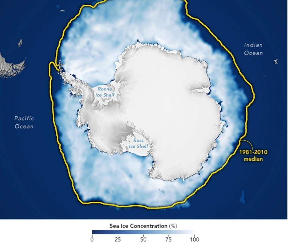 Na opublikowanym przez NASA zdjęciu satelitarnym granice lodu morskiego wokół Antarktydy wyznacza żółta linia, pokazująca, jak daleko zwykle sięgała pokrywa lodowa o tej porze roku. Jak podaje Space.com, tym razem, we wrześniu 2025 r., rzeczywisty zasięg lodu był znacznie mniejszy, bo wyniósł zaledwie 17,81 mln km2, co oznacza trzeci najniższy zimowy poziom w 47-letniej historii pomiarów. Dla porównania: średnia z lat 1981-2010 była o niemal 900 tys. km2 wyższa.