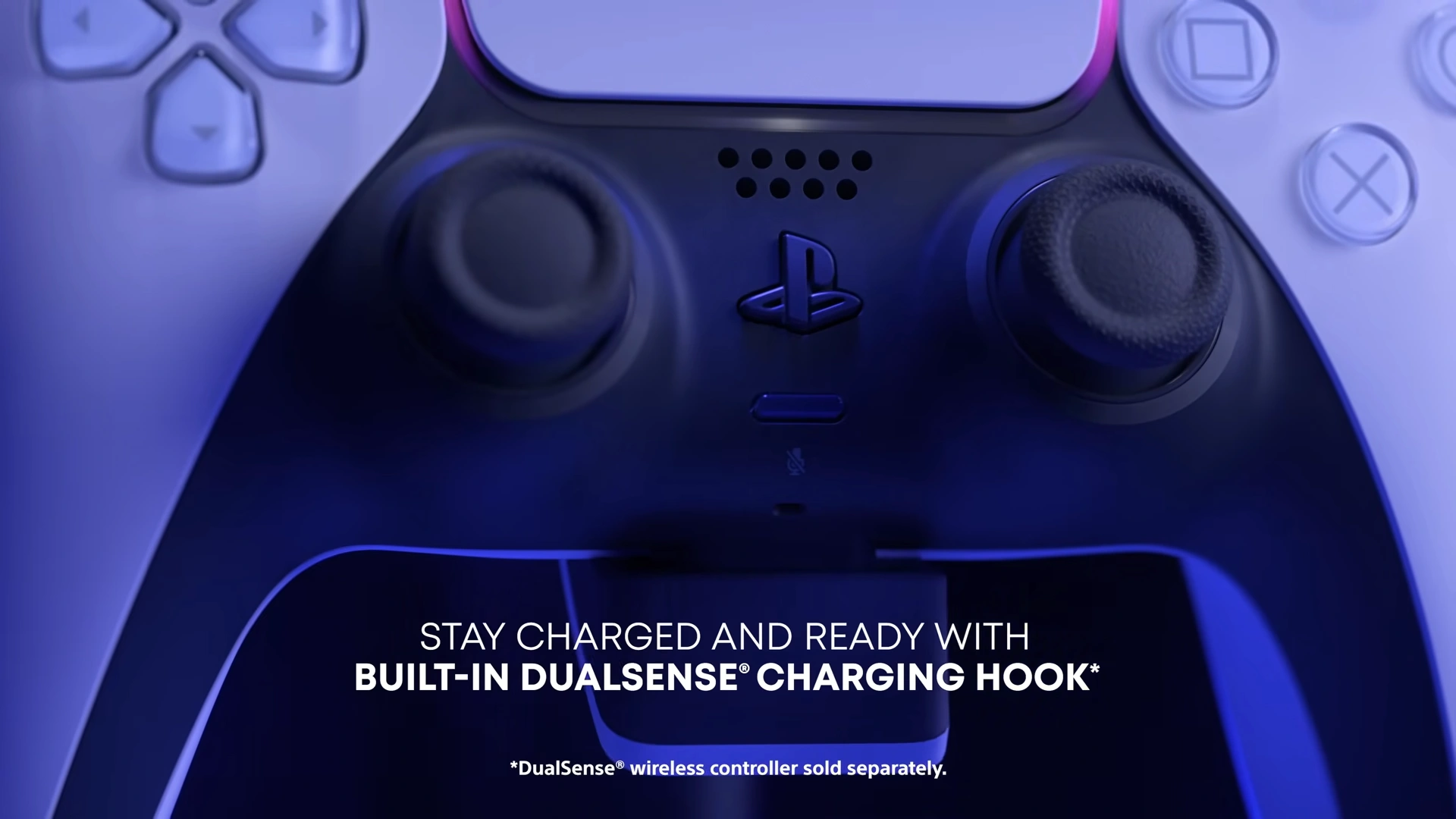 Najbardziej unikalną cechą urządzenia jest wbudowany hak do ładowania kontrolera DualSense (lub DualSense Edge). Z tyłu obudowy wysuwa się specjalne ramię, na którym można zawiesić pada, aby ten się ładował, gdy nie jest używany. Jest to drobny, ale bardzo praktyczny dodatek, który jednoznacznie identyfikuje ten produkt jako część ekosystemu PlayStation i rozwiązuje codzienny problem przechowywania kontrolera.
