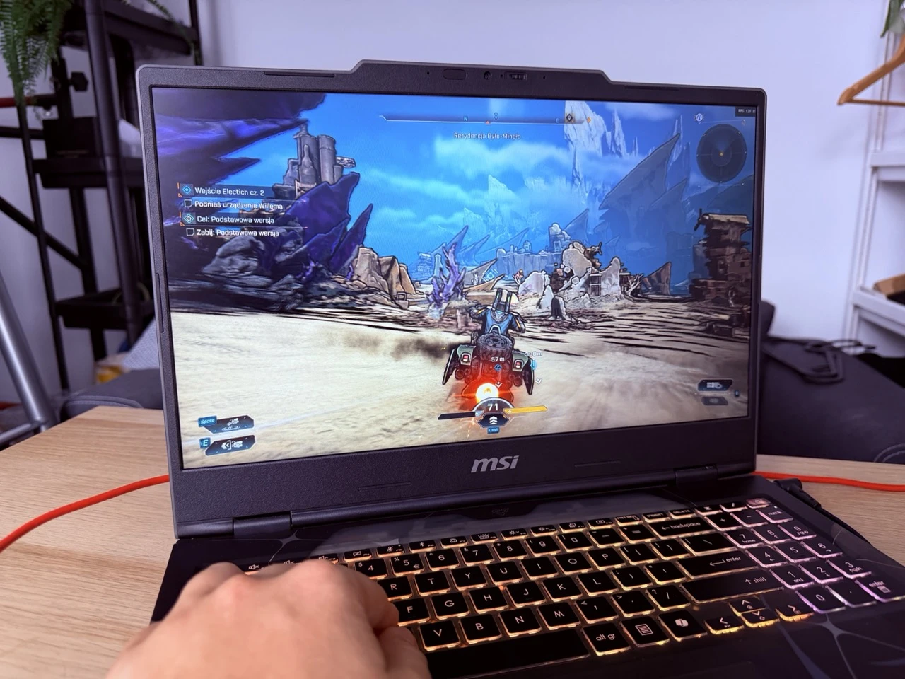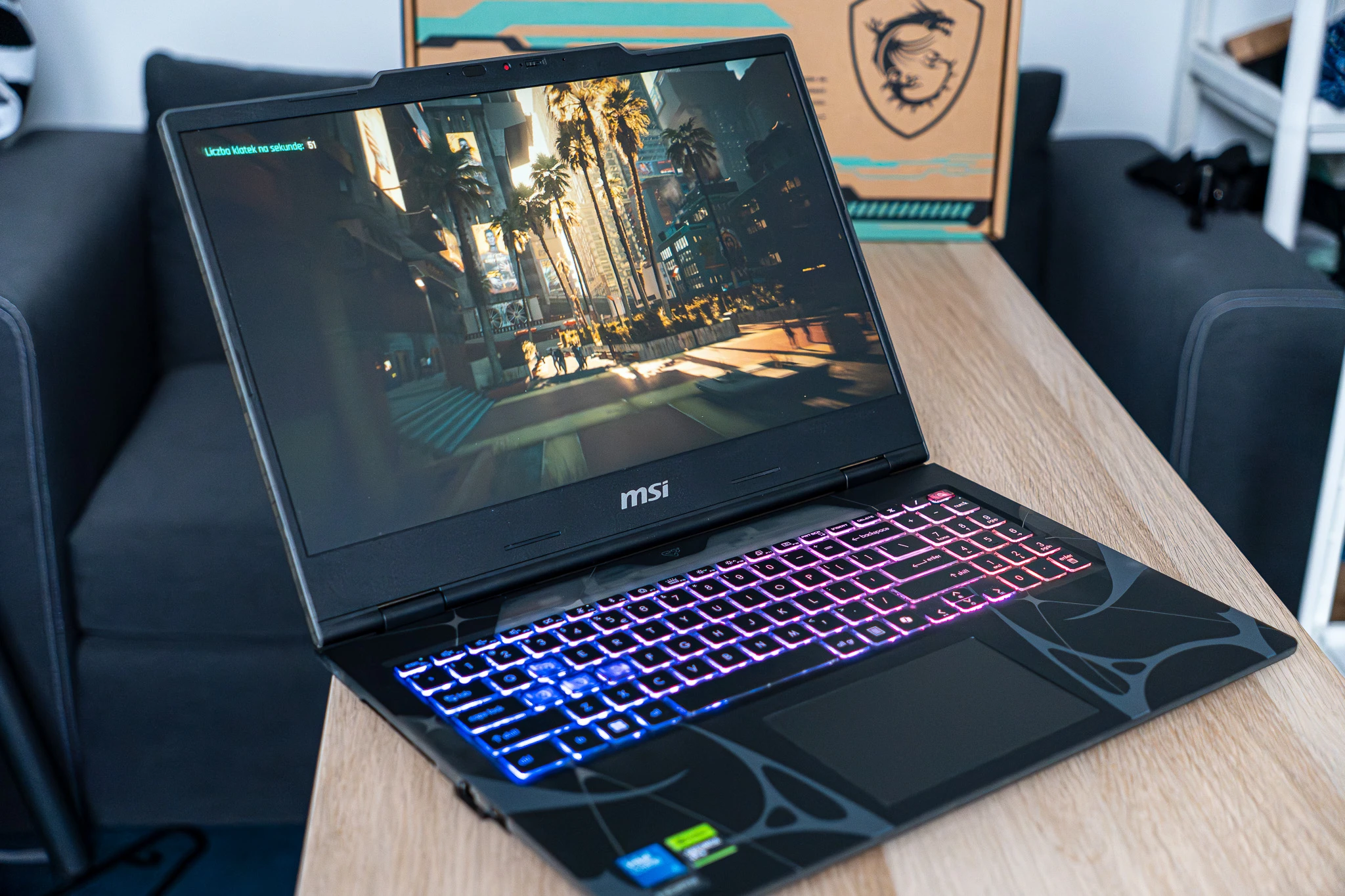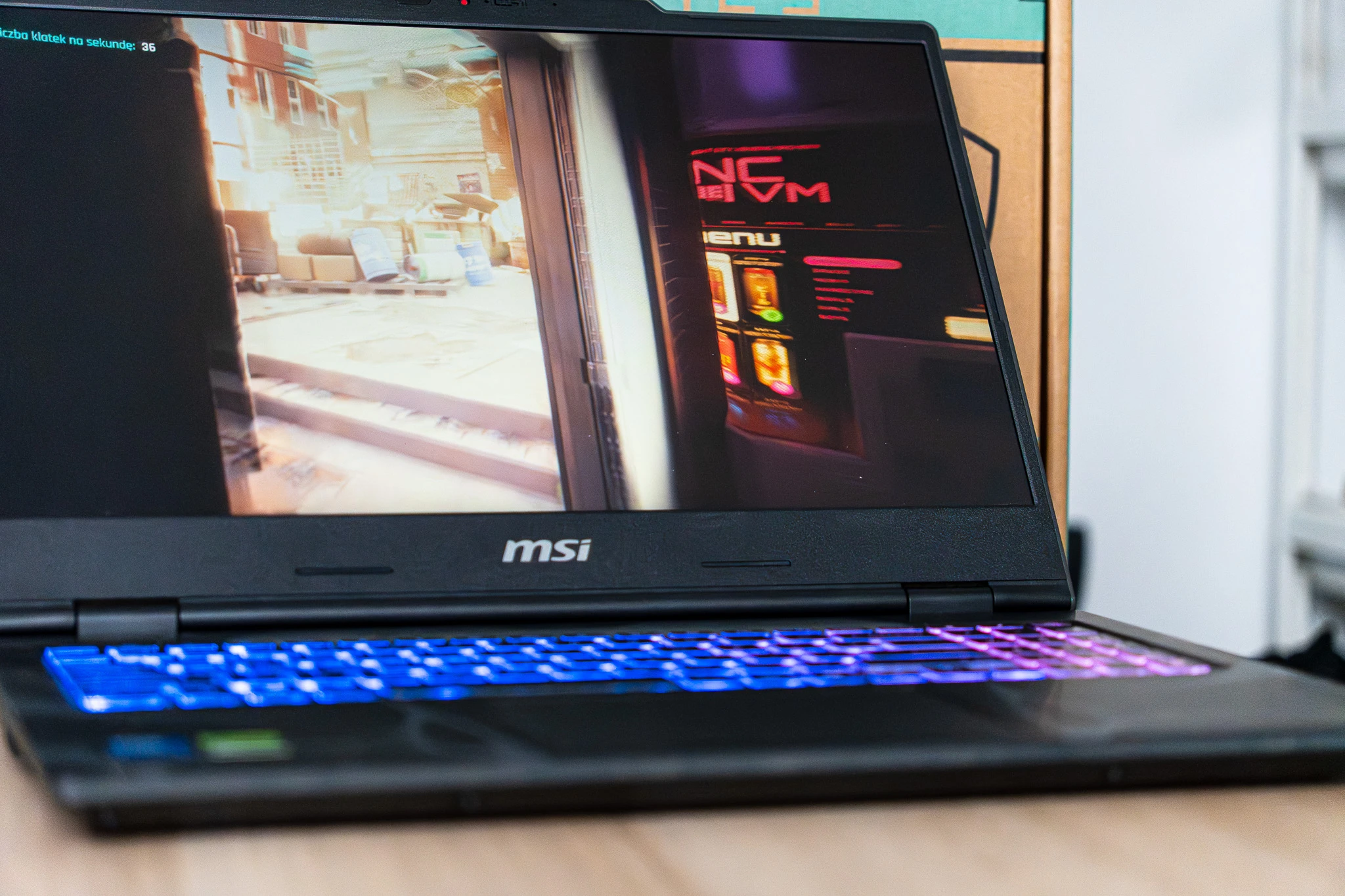 Uruchamiasz Cyberpunk 2077. Ustawienia: Ultra, ray tracing włączony, DLSS 4 Quality mode. Tradycyjnie, laptop by się pocił, a licznik kl./s. pokazywałby rozczarowujące 30. Z MSI Cyborg 15 i GeForce RTX 5050 dostajesz co najmniej 60 kl./s. Miasto Night City wygląda jak film - neony odbijają się w szybach, deszcz pada realistycznie.