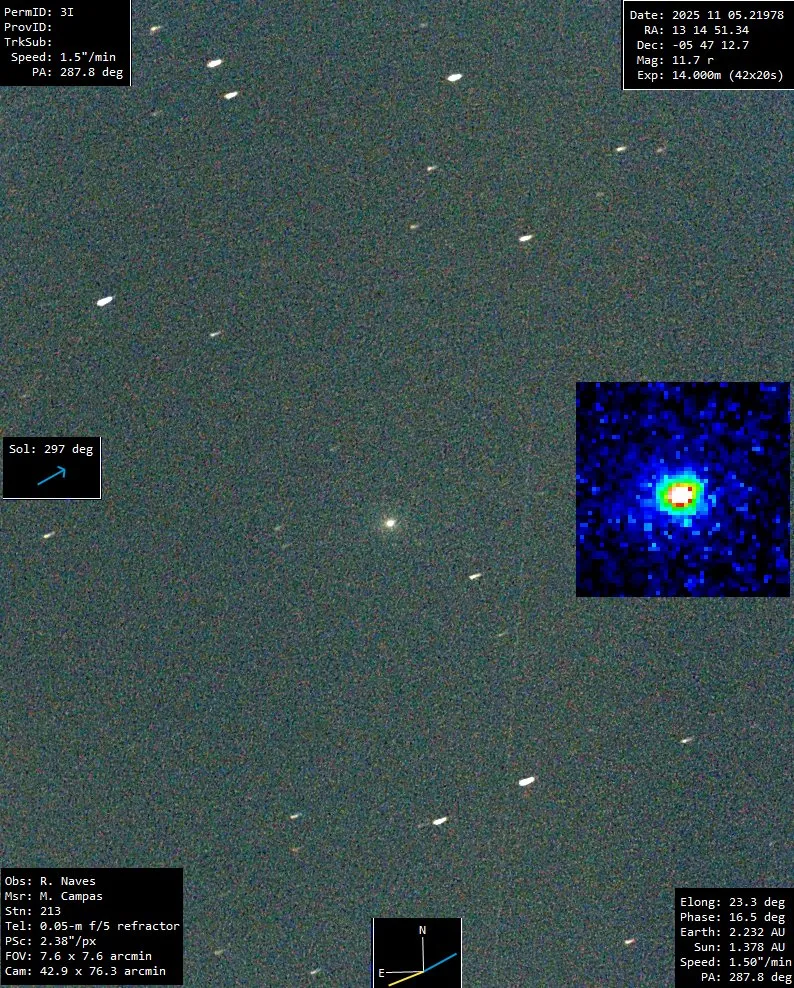Główna ilustracja: Najnowsze zdjęcie obiektu międzygwiazdowego 3I/Atlas po przejściu peryhelium, wykonane 5 listopada 2025 r. przez Obserwatorium R. Navesa, przedstawia rozmytą kulę światła. Nie widać wyraźnego warkocza komety. Źródło: Obserwatorium R. Navesa, Hiszpania