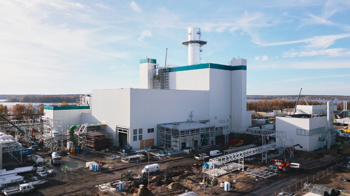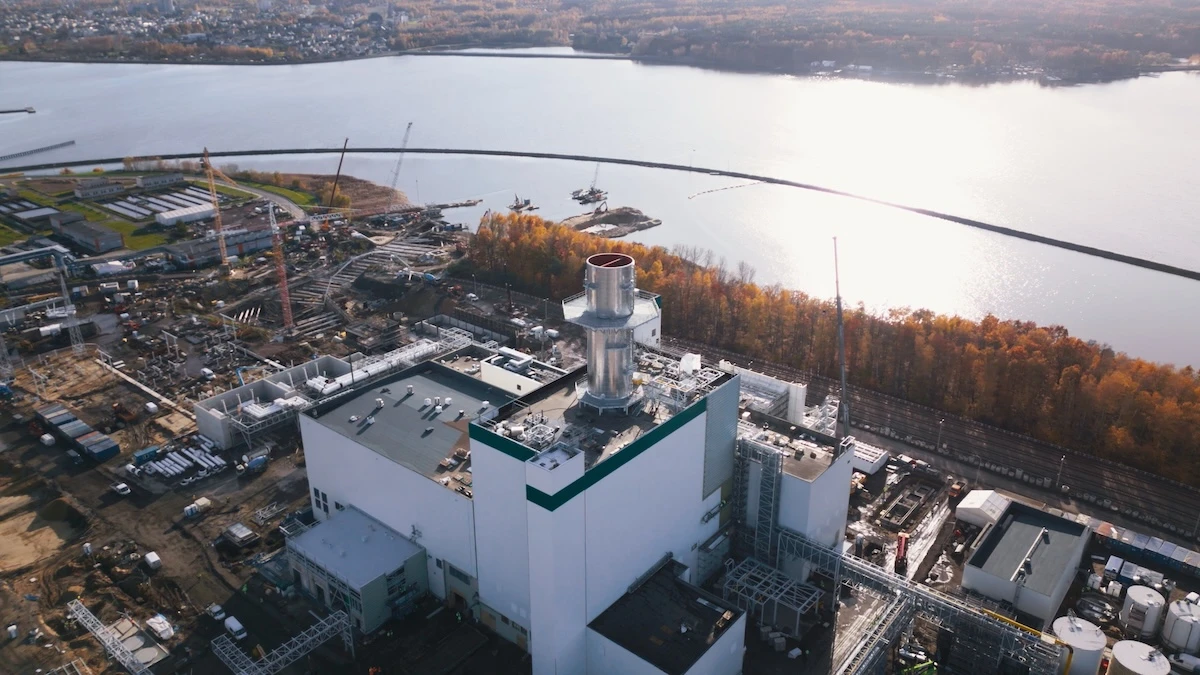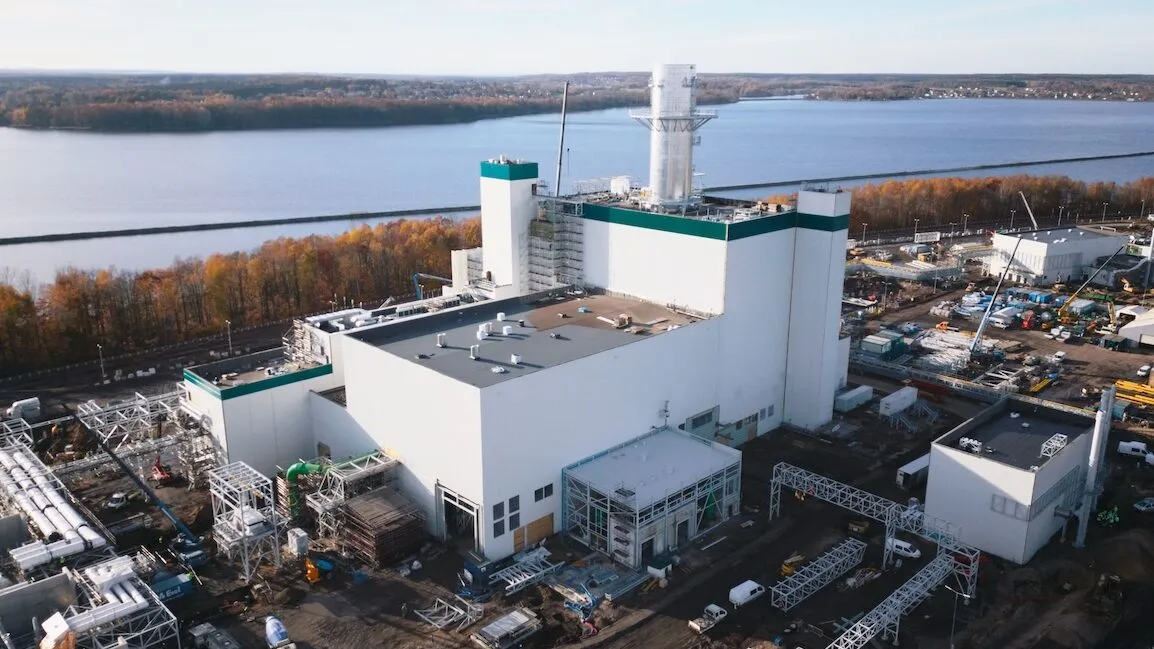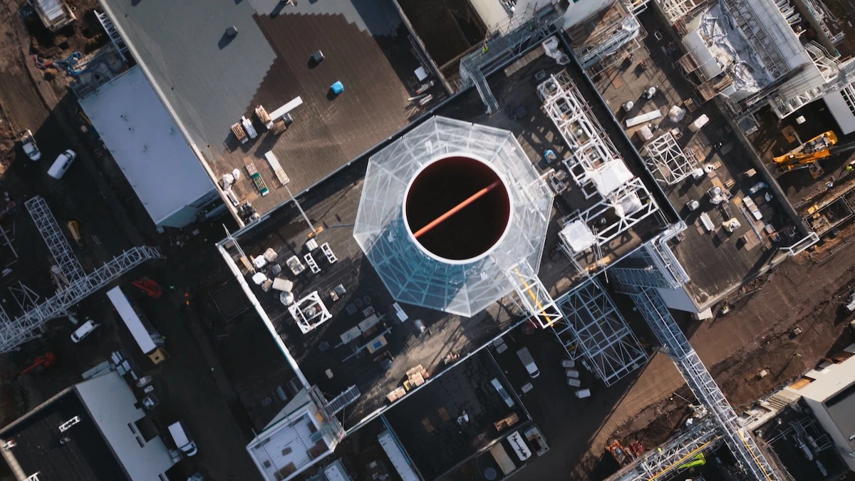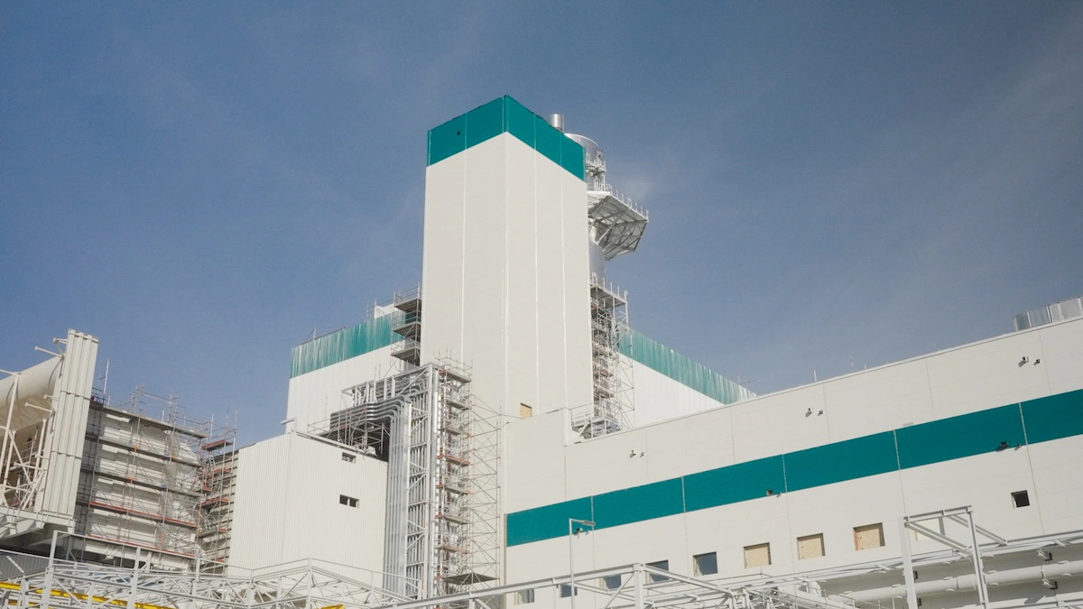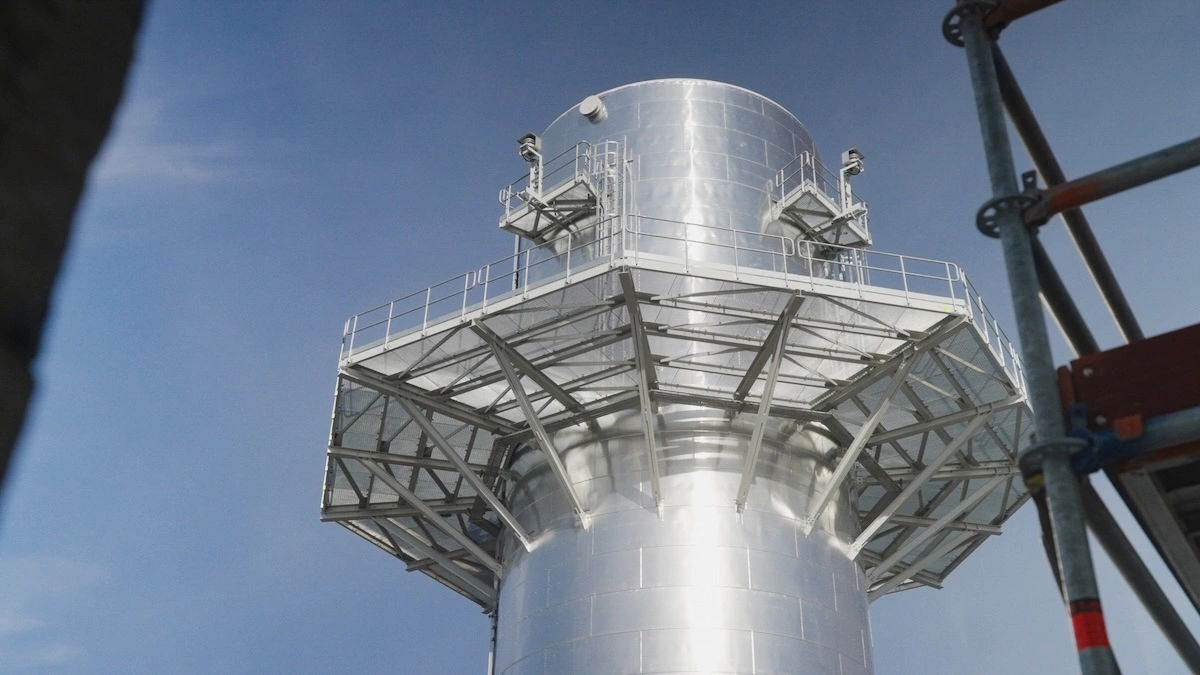 Potężnej turbiny oczywiście z zewnątrz nie widać – natomiast widać już najwyższy element całej inwestycji, czyli mierzący 75 metrów i ważący 160 ton komin, który góruje nad całą inwestycją.