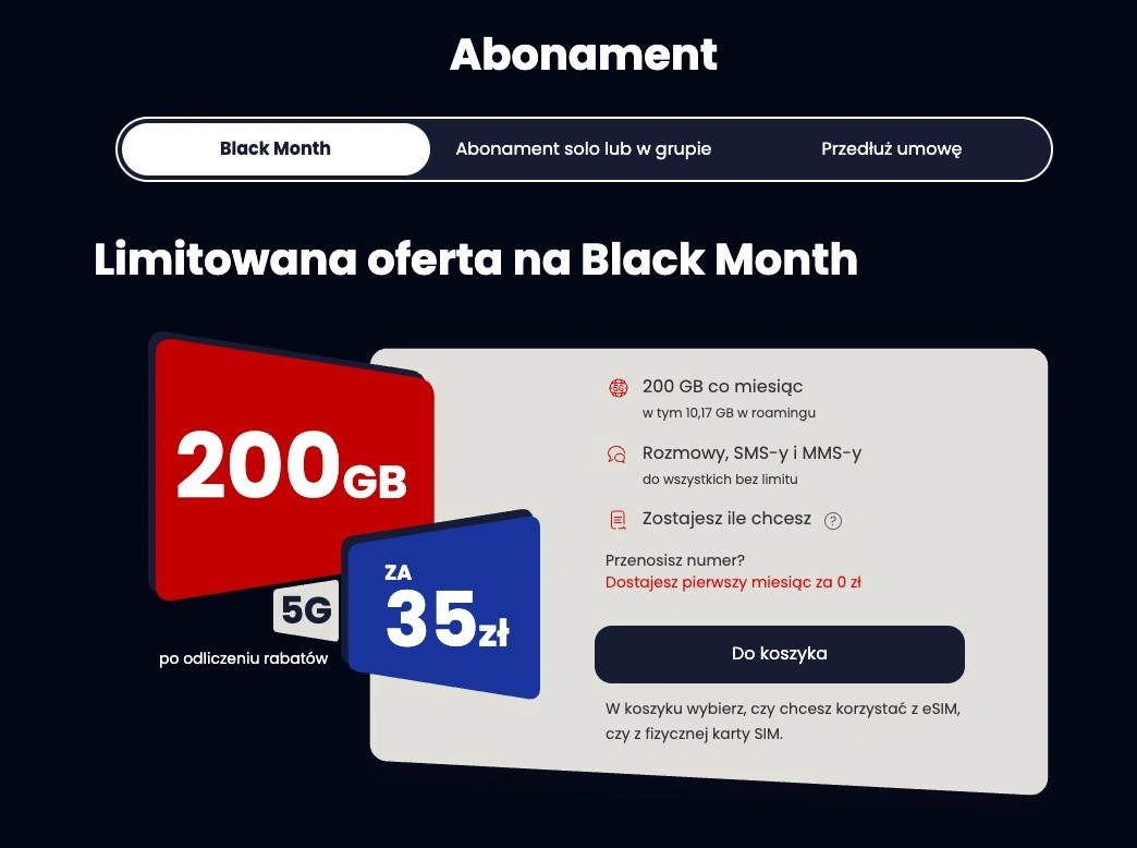 Cena 35 zł/mies. zawiera rabaty: 5 zł za e-fakturę i 5 zł za zgody marketingowe, które trzeba zaznaczyć w koszyku podczas zamawiania oferty. Po przeniesieniu numeru klienci mogą liczyć też na pierwszy miesiąc za 0 zł. Klient może zdecydować, czy chce skorzystać z klasycznej karty SIM, która przyjdzie kurierem, czy elektronicznej eSIM wysyłanej na maila.