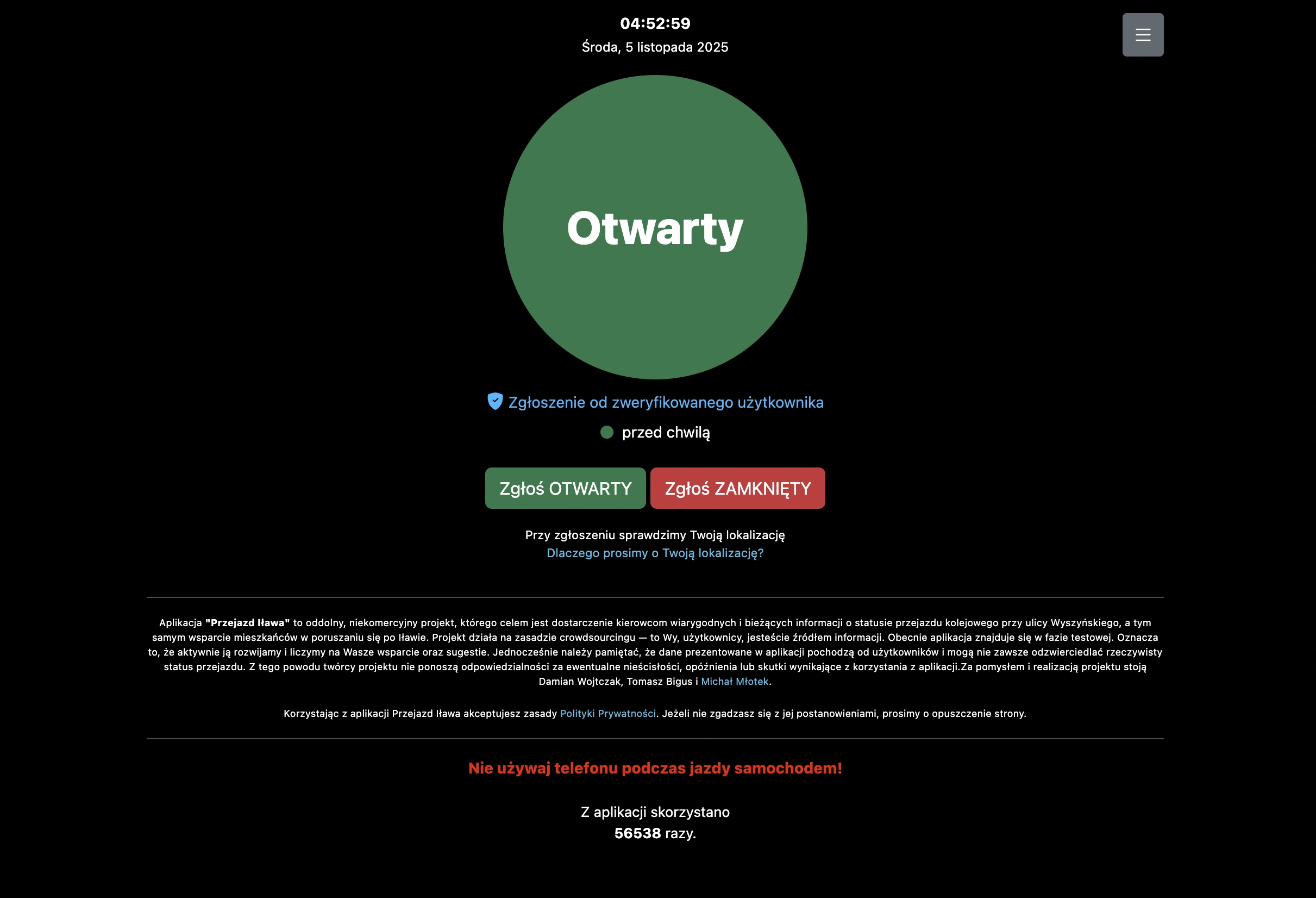 Tak powstała społecznościowa aplikacja/strona Przejazd Iława. Jej działanie jest proste: użytkownicy sami zgłaszają, czy przejazd jest aktualnie Otwarty czy Zamknięty (zgłoszenie od zweryfikowanego użytkownika zmienia status), co pozwala innym kierowcom oszczędzić czas i nerwy.