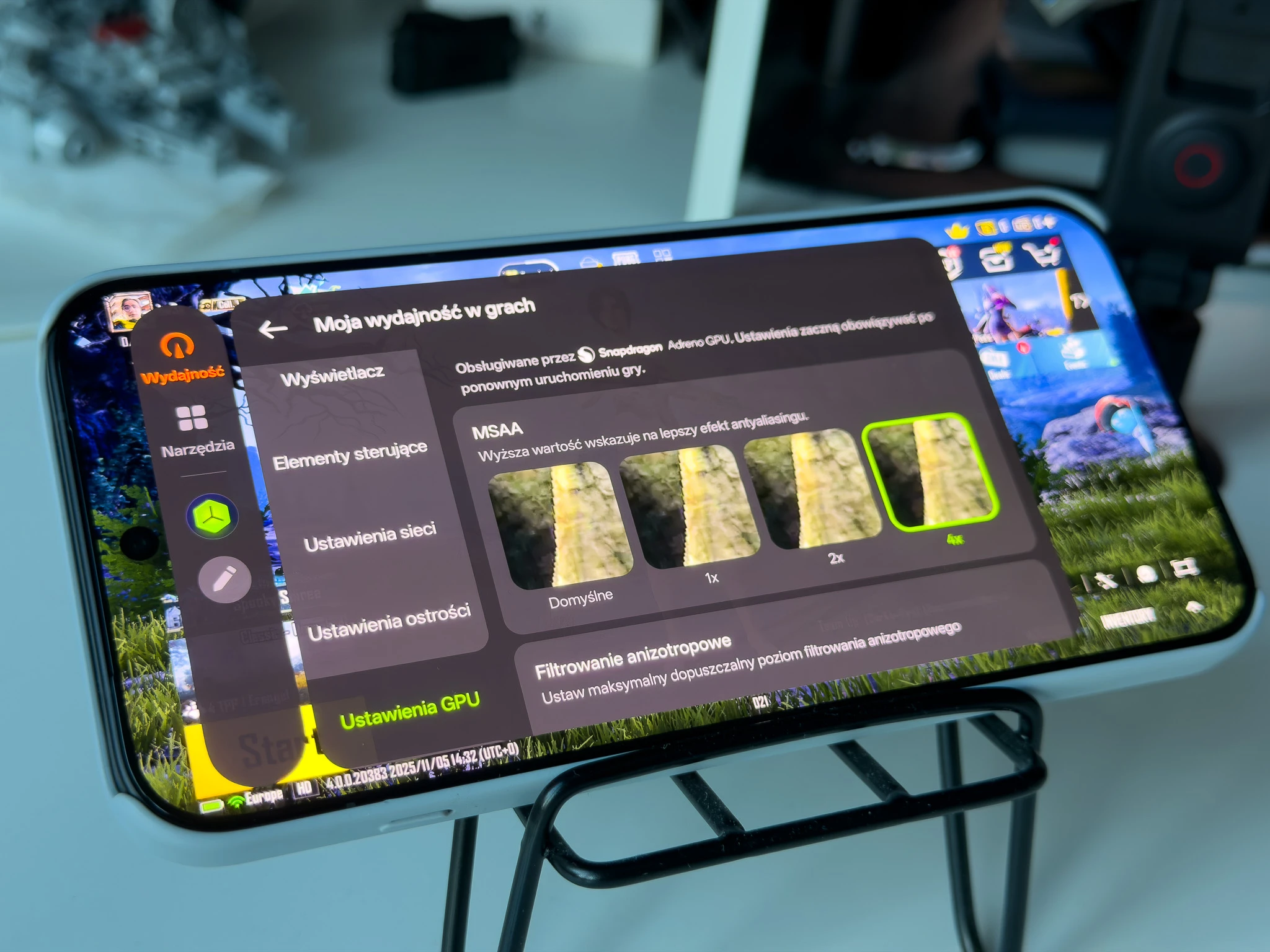 Chłodzenie jest tu aż o 42 proc. skuteczniejsze niż w modelu S24 Ultra, eliminując problem przegrzewania przy długich sesjach. Vapor chamber o 40 proc. większej powierzchni niż w poprzedniku równomiernie rozprowadza ciepło, eliminując gorące punkty, w których palce mogą czuć dyskomfort. Snapdragon Game Super Resolution upscaluje gry do wyższej rozdzielczości bez utraty wydajności, a Adreno Frame Motion Engine 2.0 interpoluje klatki, pozwalając na gry w 120 Hz nawet dla tytułów zoptymalizowanych do 60 Hz.