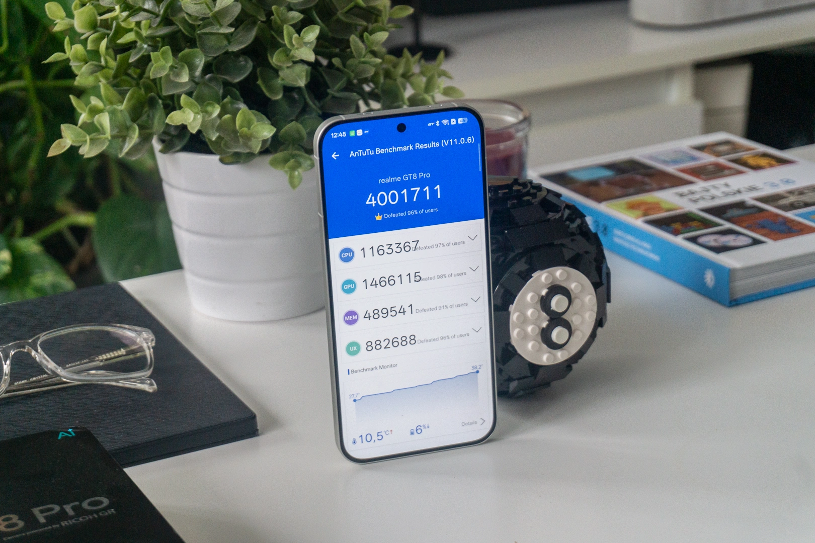 W teście AnTuTu v11 smartfon realme GT 8 Pro uzyskał zawrotne 4001711 punktów, co klasuje go w ścisłych 4% najwydajniejszych urządzeń na rynku. Najlepsze wyniki uzyskał w kategorii CPU, następnie GPU, następnie RAM. Podczas testu temperatura urządzenia wzrosła o 10 stopni Celsjusza, z 28 do 38.