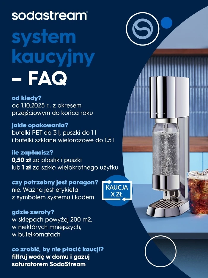 Jeśli jednak ktoś naprawdę nie chce składować pustych butelek i odnosić ich do sklepu, są sposoby, by z systemu po prostu… nie korzystać. Najprostszym rozwiązaniem jest filtrowanie wody w domu i przygotowywanie napojów samodzielnie. Jeśli zaś lubisz wodę z bąbelkami albo słodkie napoje gazowane, idealnym rozwiązaniem będzie saturator SodaStream, który pozwala gazować wodę w wielorazowych butelkach (ich trwałość to ok. 4 lata!) – bez kaucji, bez plastikowych odpadów i bez dźwigania zgrzewek. Marka oferuje też szeroką gamę syropów smakowych, dzięki którym możesz w kilka sekund przygotować ulubiony napój: od klasycznej Pepsi, przez Mirindę, 7UP, napoje owocowe, ice tea, aż po energetyki.