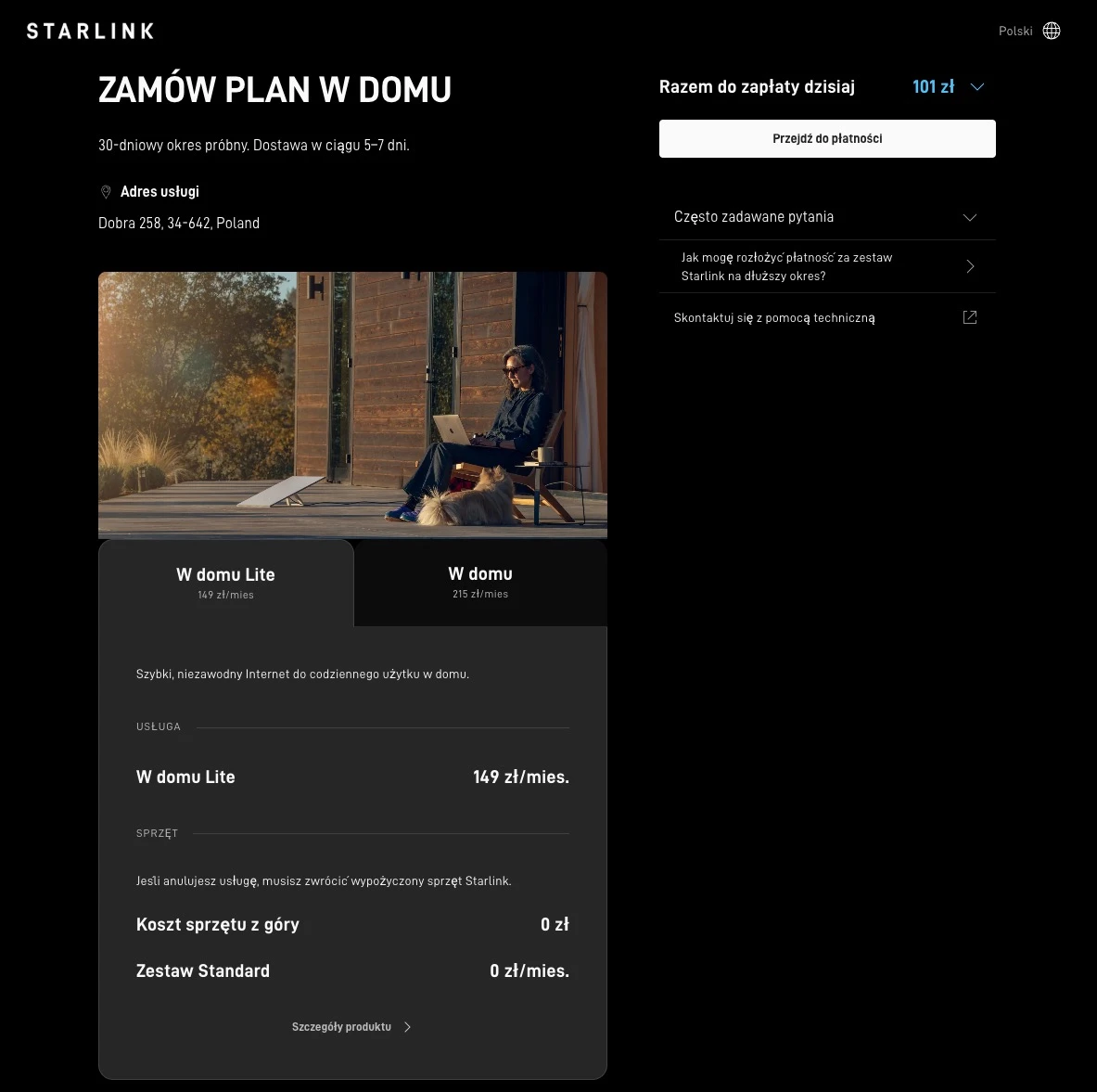 Teraz ani nie ma obowiązku kupna, ani decydowania się na długą umowę. Starlink działa na zasadzie braku wstępnej opłaty za sprzęt oraz braku długoterminowego zobowiązania. W praktyce wygląda to tak, że jeśli zamawiamy internet satelitarny Elona Muska, wybieramy tylko jeden z dwóch planów: w domu Lite za 149 zł/mies. lub w domu za 215 zł/mies.