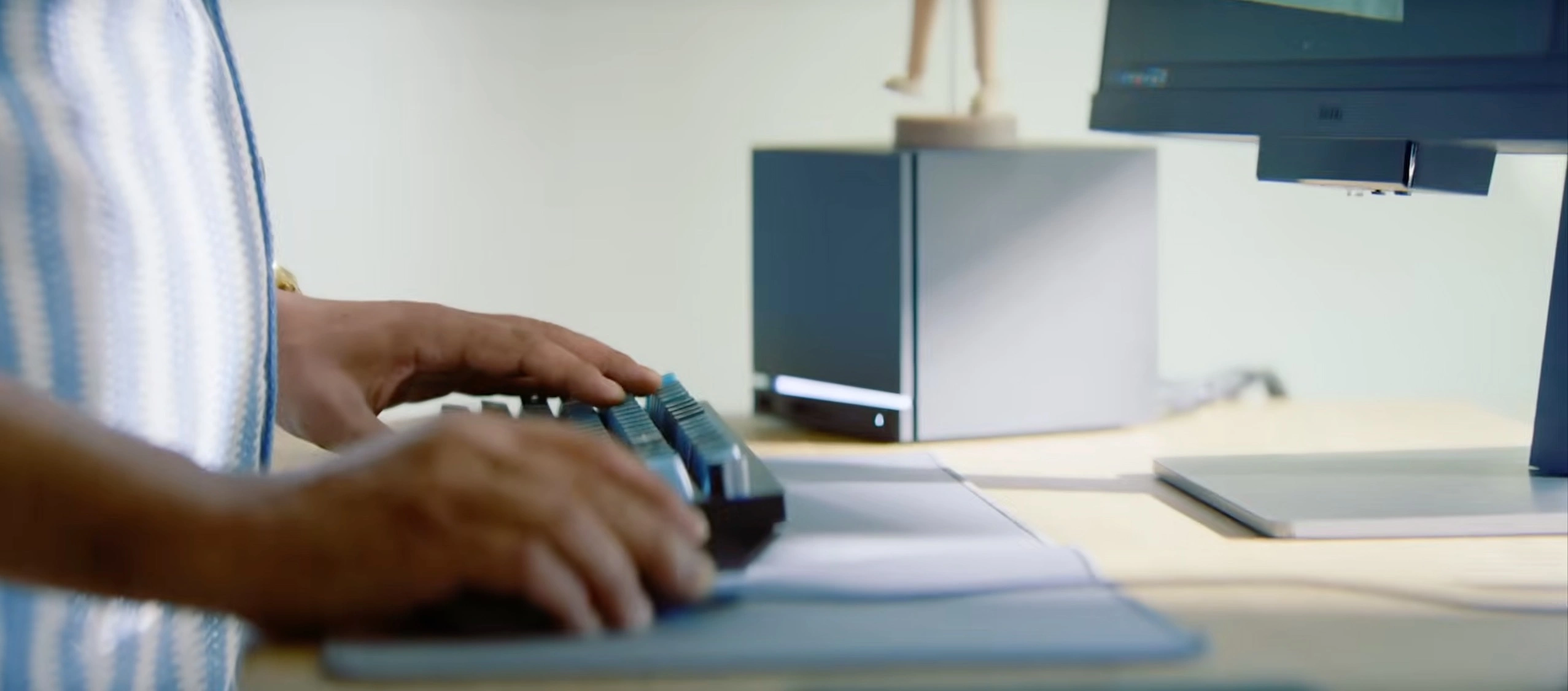 Jedynym ciekawszym elementem wzornictwa komputera jest podświetlenie w postaci paska. Panel przedni też również będzie można ściągać i wymieniać na inne. Z tyłu natomiast znajdziemy zestaw portów tak jak w klasycznych komputerach stacjonarnych z Windowsem: DisplayPort 1.4, HDMI 2.0, Ethernet 1 Gb/s, 2x USB-A, 1x USB-C oraz port zasilania.
