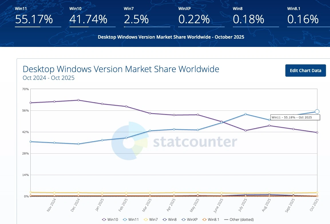 Od debiutu w 2021 r. Windows 11 zdobywał użytkowników w wyjątkowo wolnym tempie. Dopiero w czerwcu tego roku, niemal cztery lata po premierze, udało mu się wyprzedzić „dziesiątkę” pod względem rynkowego udziału. Mimo zakończenia wsparcia w październiku, Windows 10 wciąż działa na około miliardzie komputerów na świecie. To naprawdę trudno pojąć.
