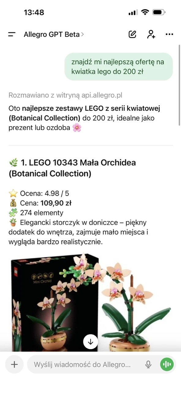 Ja zapytałem o pomysł na świąteczny prezent - zapytałem o zestaw klocków LEGO w kształcie kwiatka do 200 zł - narzędzie wyświetliło mi kilka propozycji w różnych cenach. W każdym produkcie została wyróżniona cena, liczba elementów i ocena zestawu. Pod ofertą znajdziemy też link, który prowadzi bezpośrednio do oferty znalezionej na Allegro.