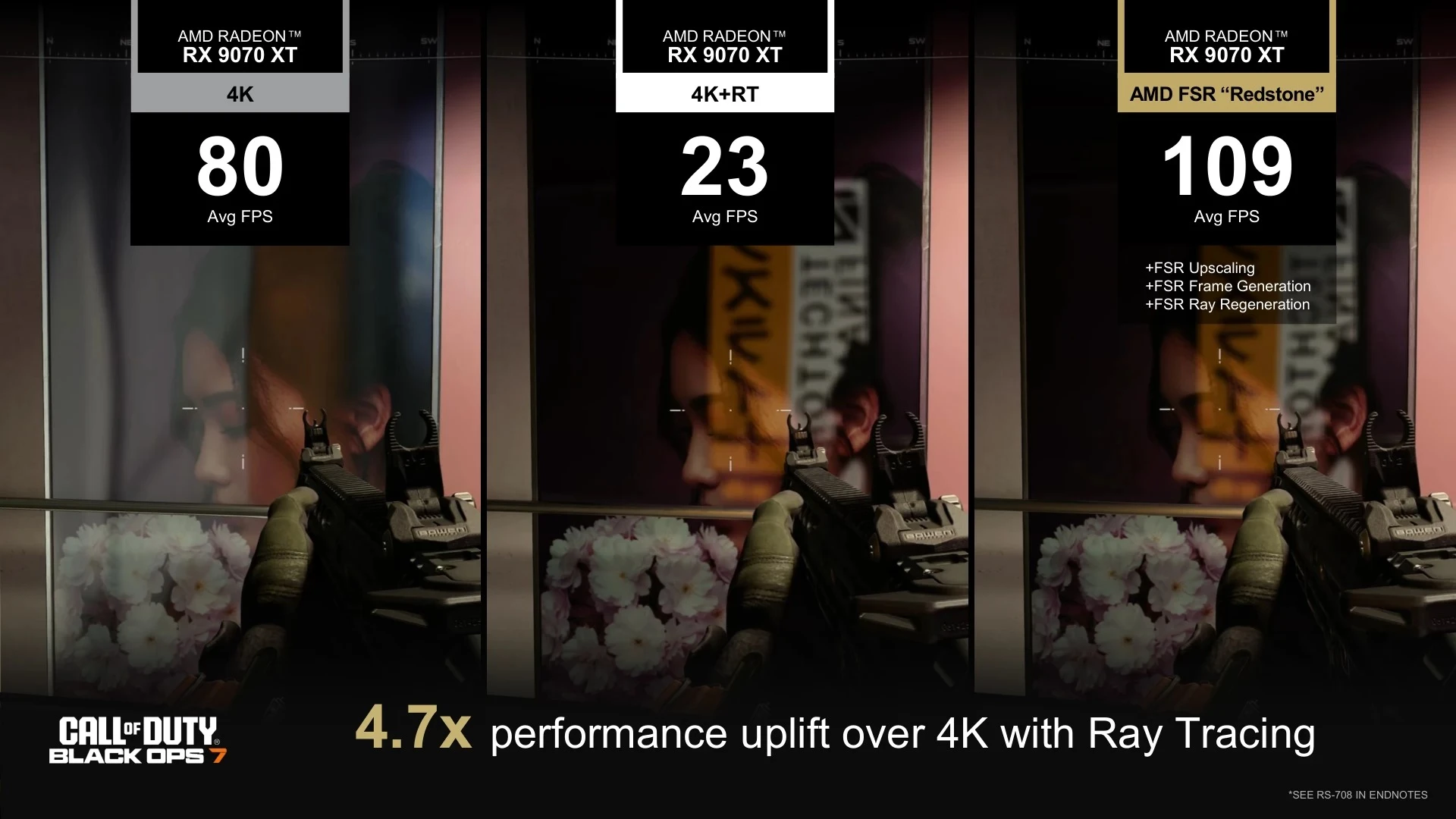 Powszechnie wiadomo, że ray tracing oraz path tracing potrafi wyciągnąć ostatnie soki nawet z nowoczesnych kart graficznych. Na przykładzie AMD pokazuje, że Radeon RX 9070 XT w Call of Duty: Black Ops 7 w 4K i śledzeniem promieni działa na 23 FPS, natomiast po włączeniu skalowania, generowania klatek i regenerowania klatek można liczyć na 109 FPS.