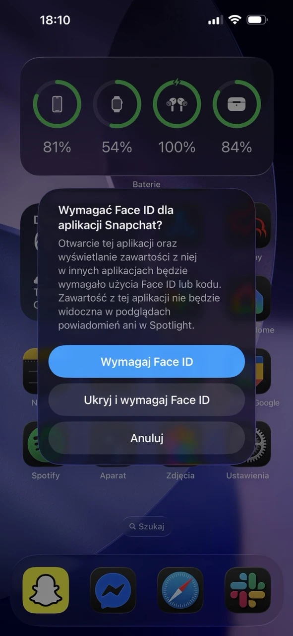 Aby uruchomić zabezpieczoną aplikację, za każdym trzeba potwierdzić swoją tożsamość za pomocą skanu twarzy lub kodu blokady ekranu. To rozwiązanie przeciwko ciekawskim osobom, które chciałyby grzebać nam w telefonie w momencie, gdy damy im urządzenie, aby np. coś sprawdziły. W iPhone można zabezpieczyć praktycznie każdą aplikację - nie tylko te zainstalowane ze sklepu, ale też systemowe.