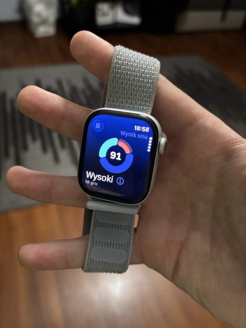Inne kwestie, które doceniam w przypadku ekosystemu to połączenie alarmów z iPhone’a. Jeśli budzik skonfigurowany na telefonie Apple’a zadzwoni, na zegarku pojawia się ekran umożliwiający jego wyłączenie lub uruchomienie drzemki. To bardzo wygodne rozwiązanie, ponieważ nie trzeba sięgać po telefon, który np. znajduje się na ładowarce indukcyjnej szafce nocnej.