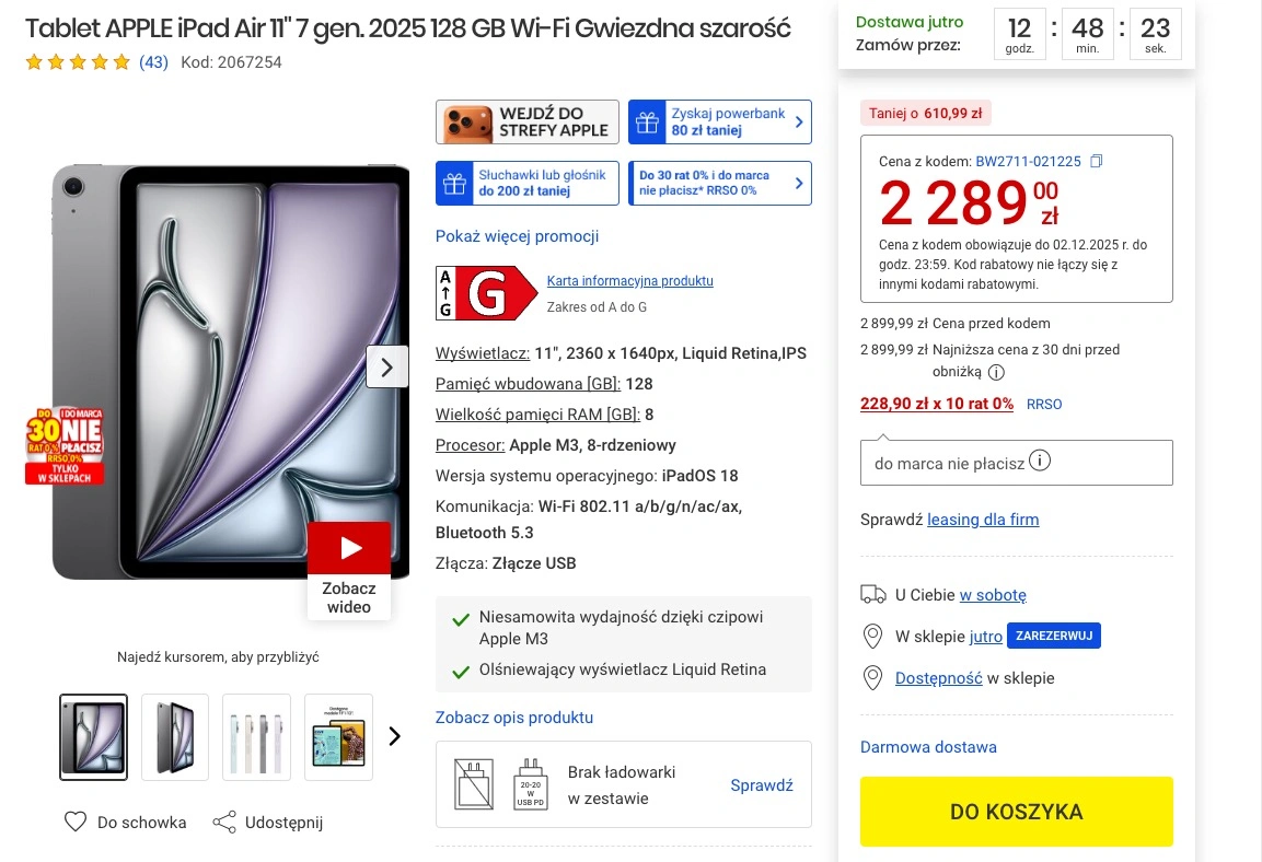 Tak jak w przypadku frytkownicy beztłuszczowej Philips Ovi, iPad 11 generacji jest obecnie przeceniony o 3 proc. co zbiło jego cenę do najniższego poziomu w ciągu ostatnich 6 miesięcy - a niewykluczone także, że od czasu premiery.