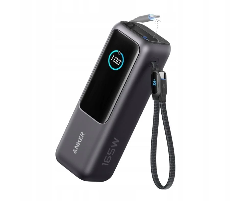 To nie jest typowy, mały powerbank do telefonu, tylko przenośne gniazdko dla całego zestawu elektroniki. Anker oferuje pojemność 25 000 mAh i moc do 165 W, więc bez problemu doładuje laptopa, telefon, tablet czy przenośną konsolę – często kilka urządzeń naraz. Wbudowany kabel USB-C i kilka portów sprawiają, że nie musisz pamiętać o dodatkowych przewodach, a całość jest stworzona z myślą o pracy i rozrywce w drodze, nie tylko o awaryjnym podbiciu baterii w smartfonie.