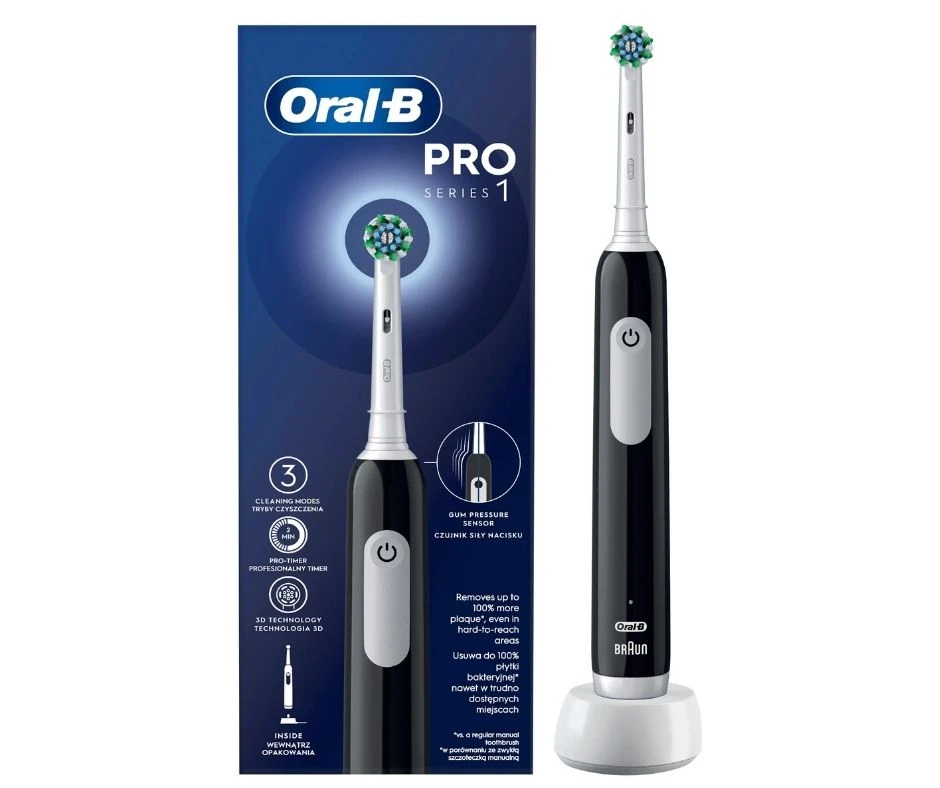 Oral-B Pro Series 1 Black to rotacyjna szczoteczka elektryczna z jedną końcówką w zestawie – idealna jako pierwszy krok po przesiadce z manuala, na prezent albo jako drugie urządzenie do podróży.