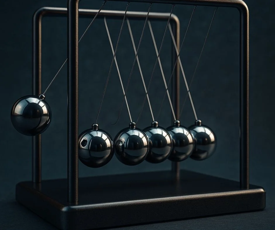 Kluczem do tego zachowania jest geometryczne spłaszczenie gazu do jednej linii. W trójwymiarowej przestrzeni podczas zderzeń cząstki rozbiegają się w różne strony. W jednowymiarowym kanale nie ma takiej swobody: atomy mogą tylko doganiać się i odbijać wzdłuż tej samej prostej. Fizycy porównują to do biurkowej zabawki znanej jako kołyska Newtona. Gdy odciągniemy kulkę na jednym końcu i puścimy, uderzenie przechodzi przez cały rząd kul jak fala, a wychylenie pojawia się na drugim końcu. Poszczególne kulki na środku prawie się nie poruszają, ale pęd i energia są przekazywane dalej bez widocznej utraty.