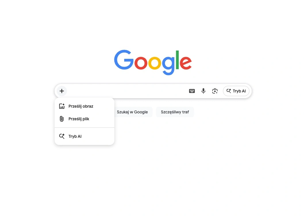 W witrynie Google na pasku wyszukiwania znajdziemy nową ikonkę plusa po lewej stronie. Dotychczas w tym miejscu znajdowała się ikonka lupy. Rozwiązanie zostało wyciągnięte z interfejsu czatbota Gemini i zapewnia trzy opcje: