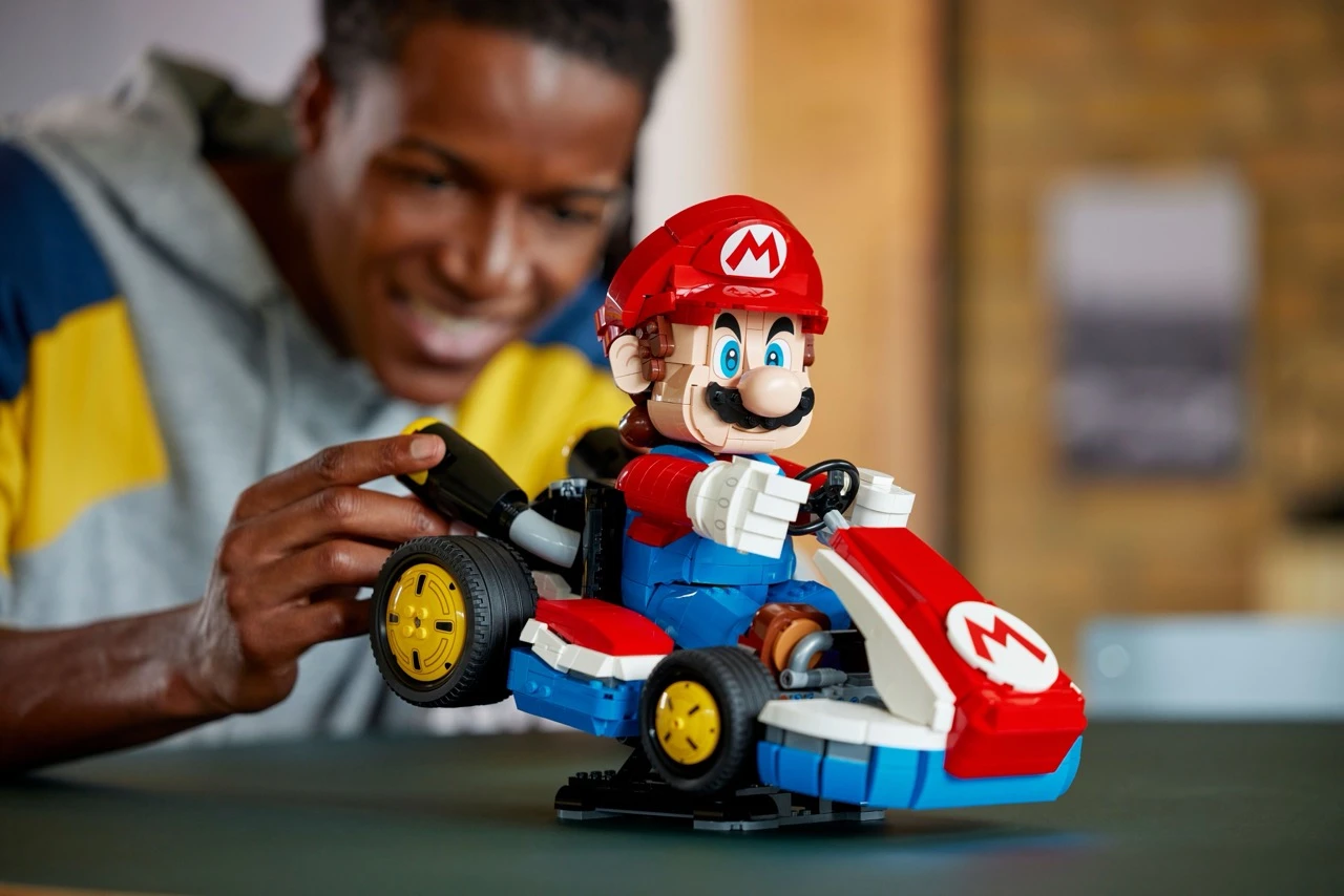 To prawie dwa tysiące elementów czystej, gokartowej radości i nostalgia w najczystszej formie! Gra Mario Kart ożywa w trójwymiarze - masz tu postać Mario siedzącego za kierownicą ikonicznego gokarta, ustawionego w dramatycznym kącie driftu, jakby właśnie pokonywał zakręt na Rainbow Road.