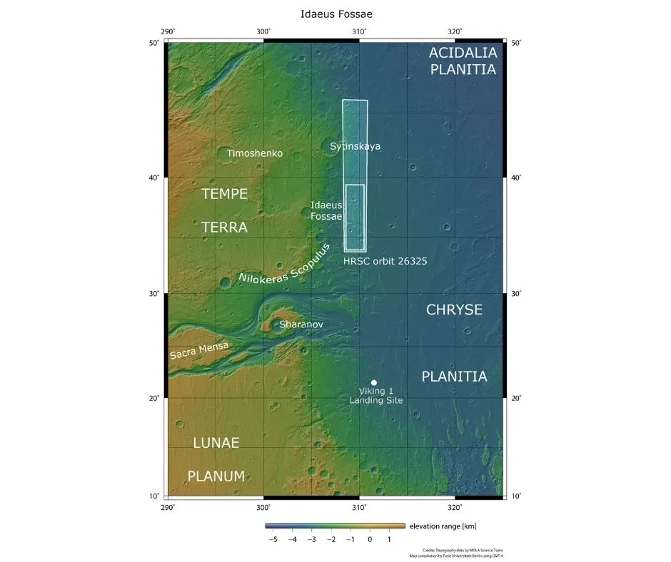 Krater w kształcie motyla znajduje się w Idaeus Fossae, czyli złożonym układzie dolin biegnącym w pobliżu wysokiej krawędzi płaskowyżu Tempe Terra. Okolica pełna jest śladów przeszłych procesów geologicznych: od starożytnych epizodów wulkanizmu, po rozciąganie i zapadanie skorupy. Na zachodzie obrazu ESA uchwyciła grupę masywnych mes, czyli płaskich szczytów przypominających stoły skalne, które tworzą ostatnie relikty erozji. Na ich brzegach widać ciemne, bogate w magnez i żelazo warstwy dawnych przepływów lawy i popiołów.