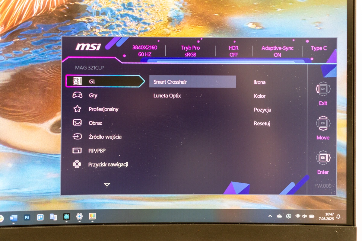 Joystick OSD umieszczony z tyłu obudowy działa intuicyjnie, choć jego lokalizacja wymaga chwili przyzwyczajenia. Menu jest przejrzyste i logicznie zorganizowane - MSI wie, jak robić OSD.