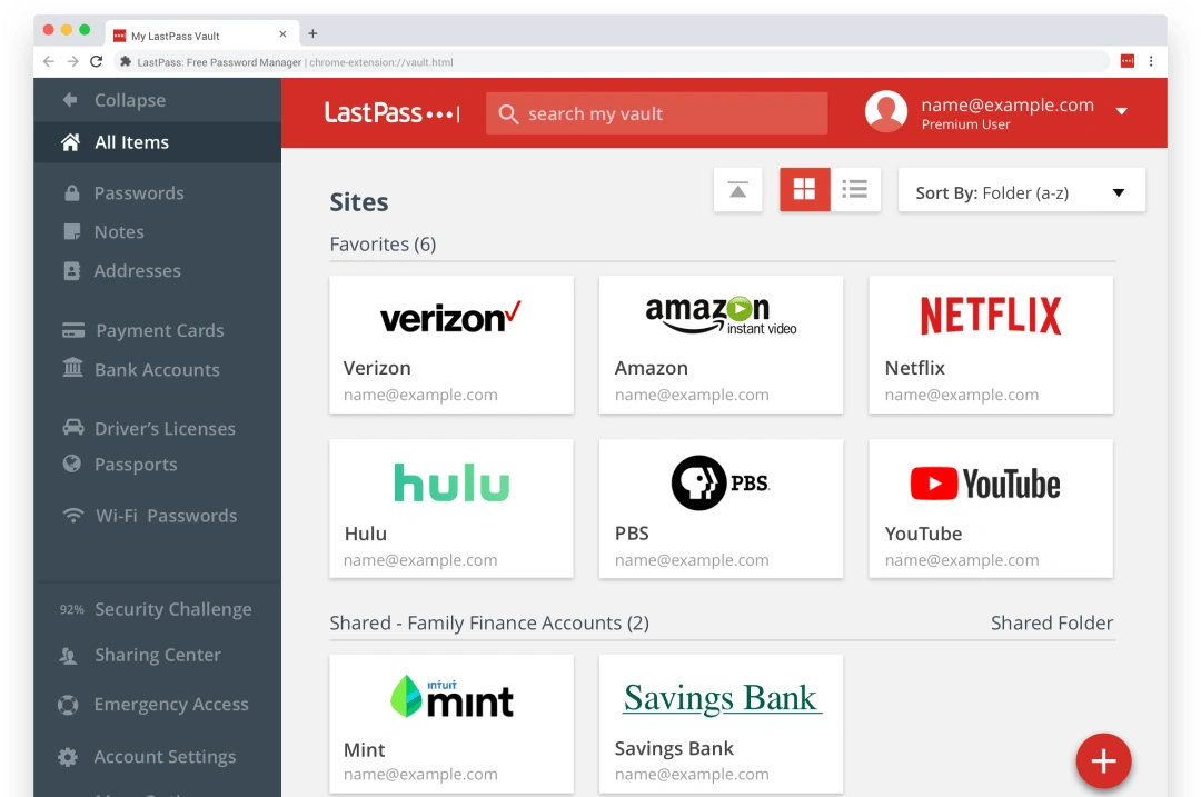 LastPass to jedna z najbardziej rozpoznawalnych marek na rynku menedżerów haseł. Pod względem funkcji trudno mu cokolwiek zarzucić: interfejs jest wygodny, konfiguracja szybka, a codzienne korzystanie nie sprawia problemów. Obsługa udostępniania, organizacji sejfów i autouzupełniania jest na poziomie, którego można oczekiwać od produktu najwyższej klasy.