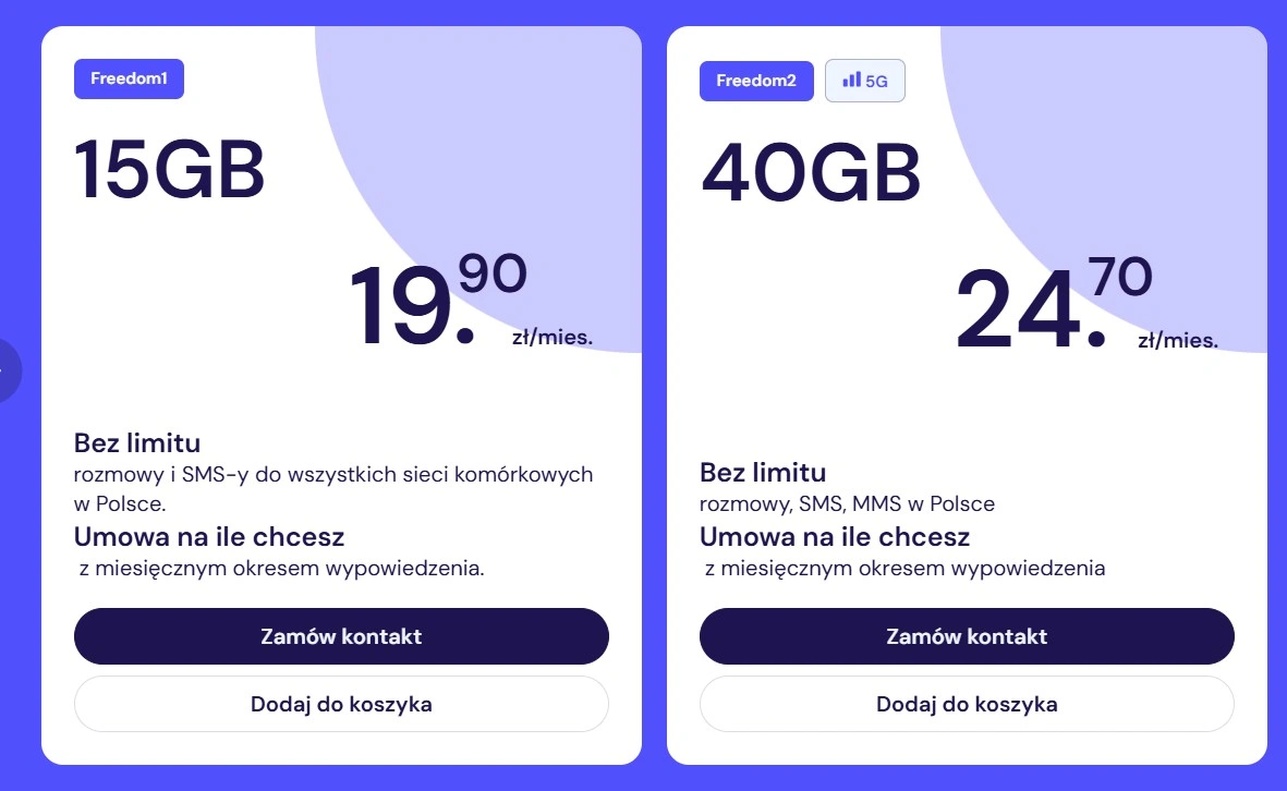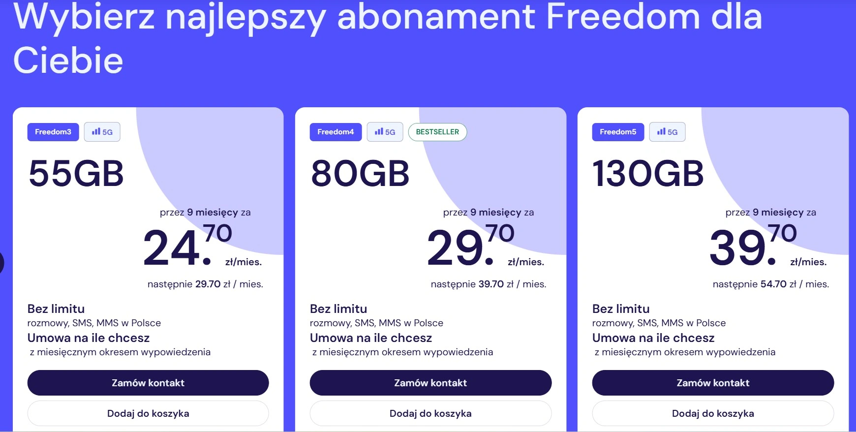 Plan Freedom3 kosztuje przez pierwsze 9 miesięcy jedyne 24,70 zł, a po tym czasie cena rośnie do nadal konkurencyjnych 29,70 zł. W tym abonamencie znajdziecie 55 GB internetu. Chcecie więcej? Nie ma problemu - Freedom4 przez pierwsze 9 miesięcy kosztuje 29,70 zł, później cena wzrasta do 39,70 zł. Znajdziecie w nim aż 80 GB internetu, ale jeżeli to nadal zbyt mało, to czeka na was topowy abonament Freedom5. Przez pierwsze 9 miesięcy kosztuje 39,70 zł, później cena rośnie do 54,70 zł. W tym pakiecie co miesiąc macie 130 GB internetu.