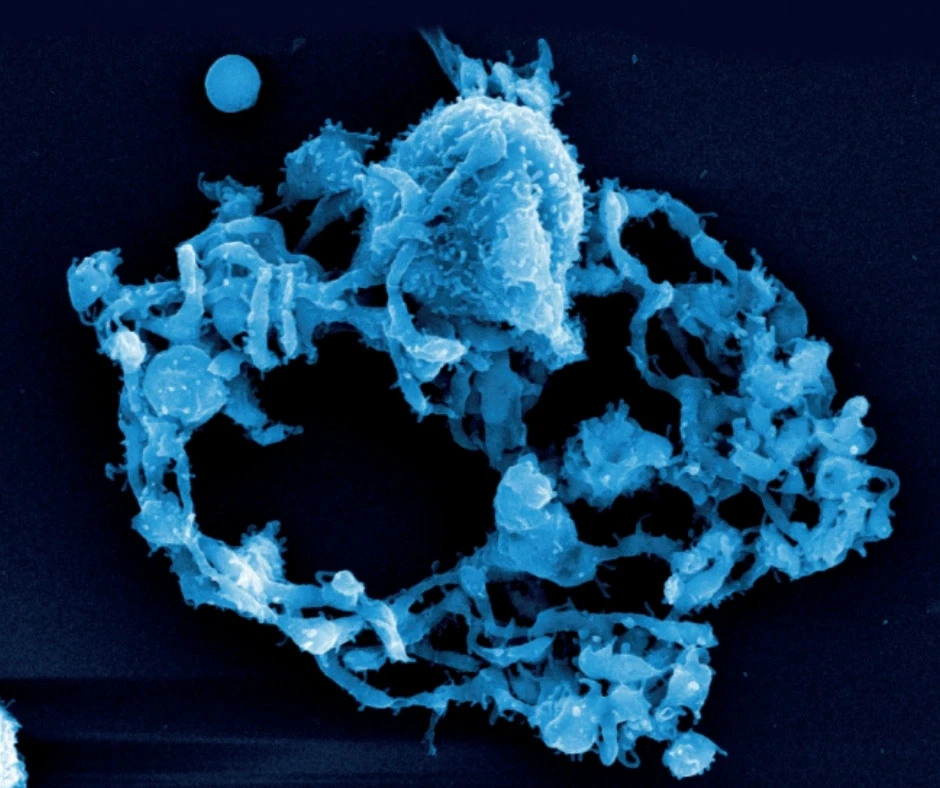 Maj przenosi nas na pokład Międzynarodowej Stacji Kosmicznej, ale w skali mikroskopowej. Na ilustracji widać komórkę megakariocytarną, czyli komórkę macierzystą produkującą płytki krwi, obserwowaną w eksperymencie prowadzonym w mikrograwitacji. Rozgałęziające się wypustki komórki przypominają wieniec, z którego odrywają się przyszłe płytki. NASA wykorzystuje takie badania, żeby lepiej zrozumieć, jak długotrwały pobyt w kosmosie wpływa na krzepnięcie krwi i ryzyko powikłań u astronautów.