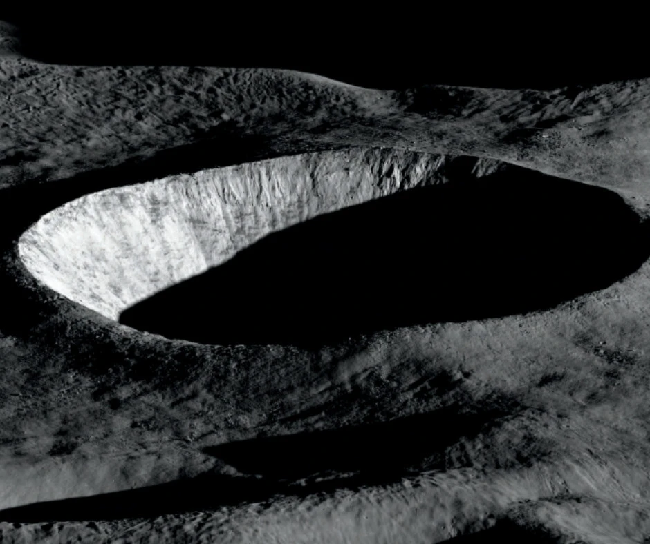 W marcu dostajemy coś pozornie prostego: fragment księżycowego krateru w niskim świetle poranka. To zdjęcie z sondy LRO, wykonane systemem kamer LROC. Światło muska tylko zachodnią ścianę krateru, reszta tonie w cieniu. Ten pozorny minimalizm dobrze pokazuje, po co w ogóle powstała misja LRO – żeby zbudować trójwymiarową mapę Księżyca, znaleźć zasoby takie jak lód w wiecznym cieniu i przygotować teren pod kolejne lądowania.