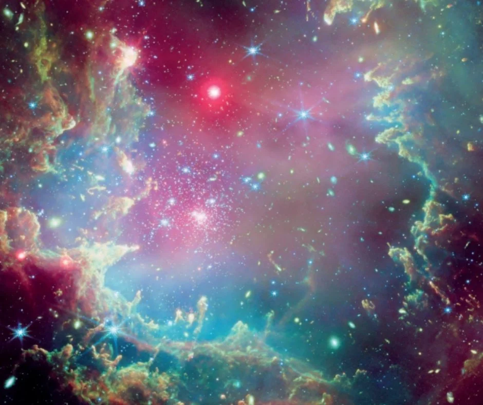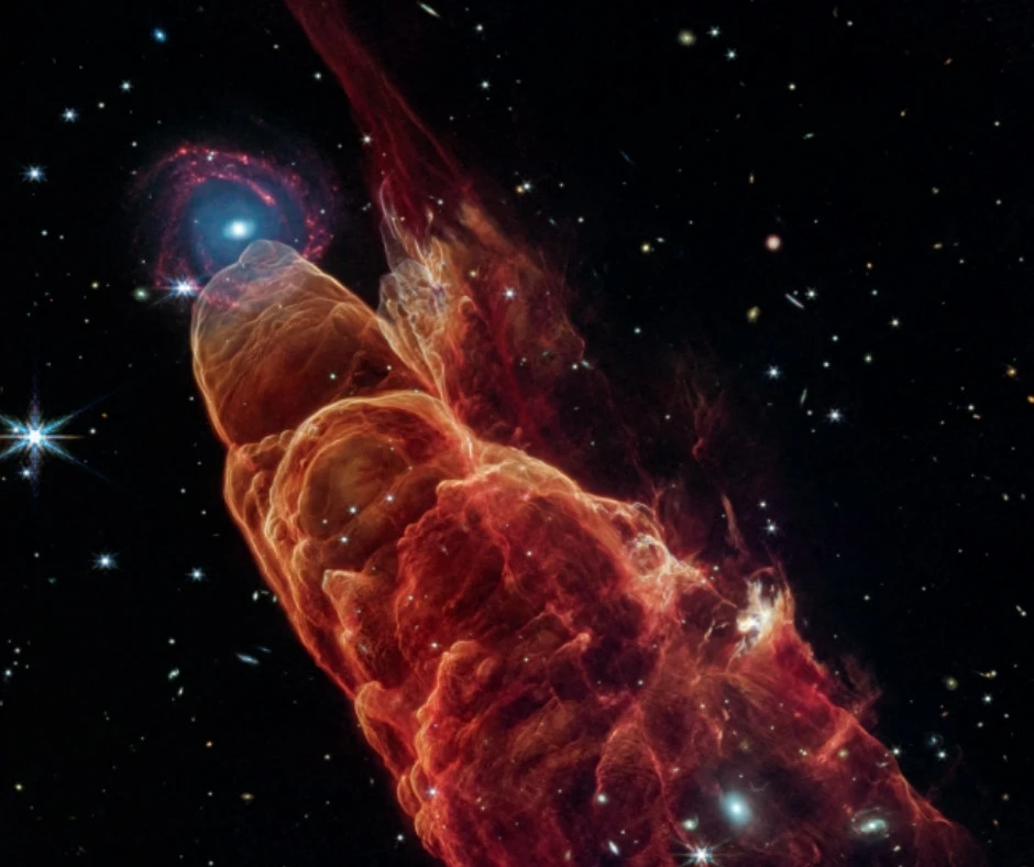 Każdy miesiąc w kalendarzu to osobna historia. Styczeń zaczyna od sceny, którą łatwo pomylić z kadrem z filmu science fiction. To Herbig-Haro 49/50 – kosmiczny obiekt w pobliżu młodej gwiazdy, który teleskop Jamesa Webba pokazał w niezwykle szczegółowy sposób. Strumienie materii wyrzucanej przez rodzącą się gwiazdę wyglądają jak rozciągnięty, pomarańczowo-czerwony wir, a w tle widać odległą galaktykę spiralną. Jeden obraz opowiada historię narodzin gwiazd i tego, jak ich dżety rzeźbią otoczenie.