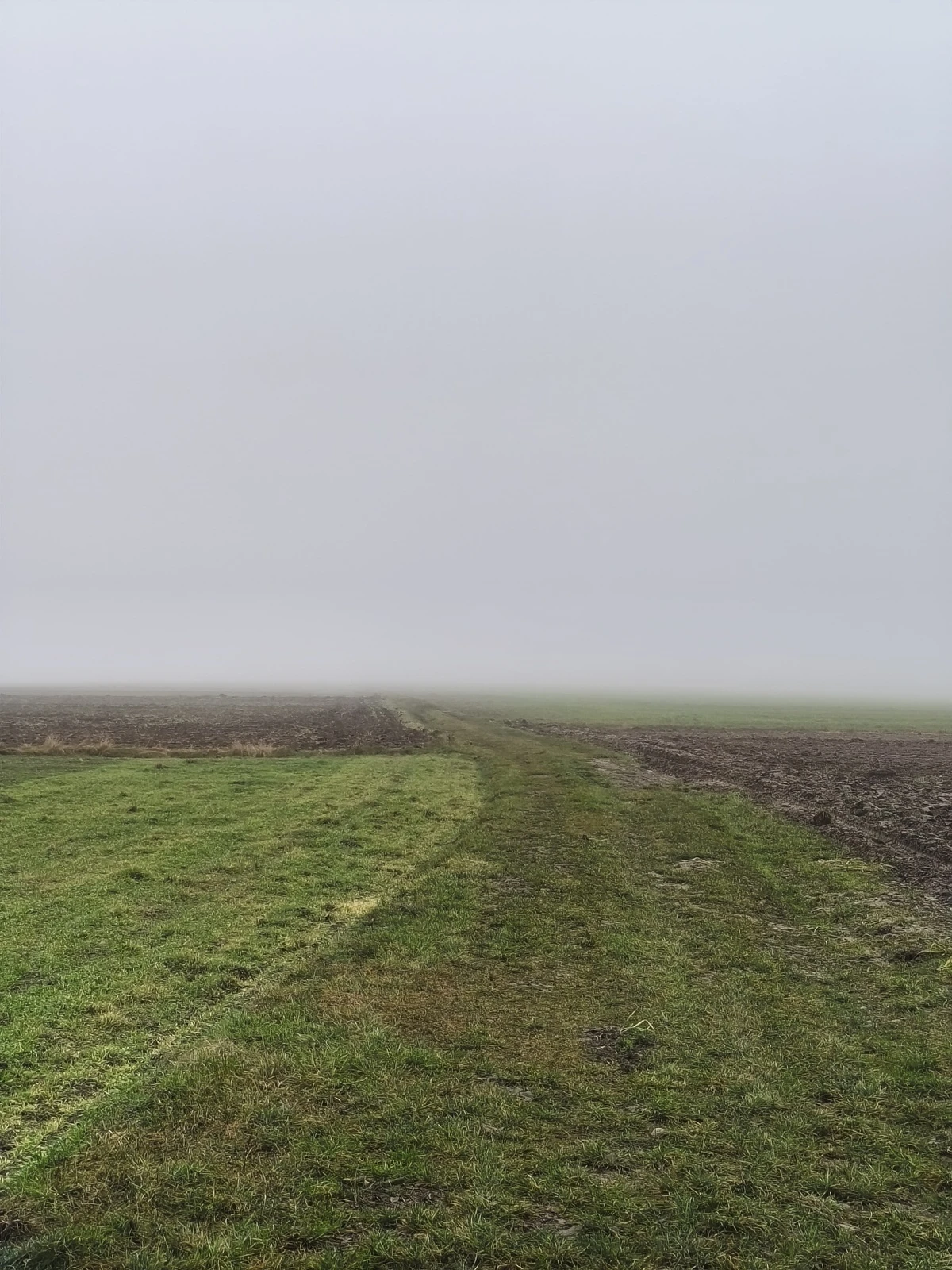 Nie mogłem się powstrzymać. Musiałem wyjąć telefon, żeby zrobić zdjęcia. Wysepka z drzewek na polu wyglądała jak ostatnie miejsce na Ziemi – za nią już tylko mgła, przepaść, koniec. Ścieżki prowadzące donikąd, które nagle się urywały. Miałem ochotę fotografować wszystko, ale sam dawałem sobie po łapach. Spacer jest po to, żeby sobie darować ekran.
