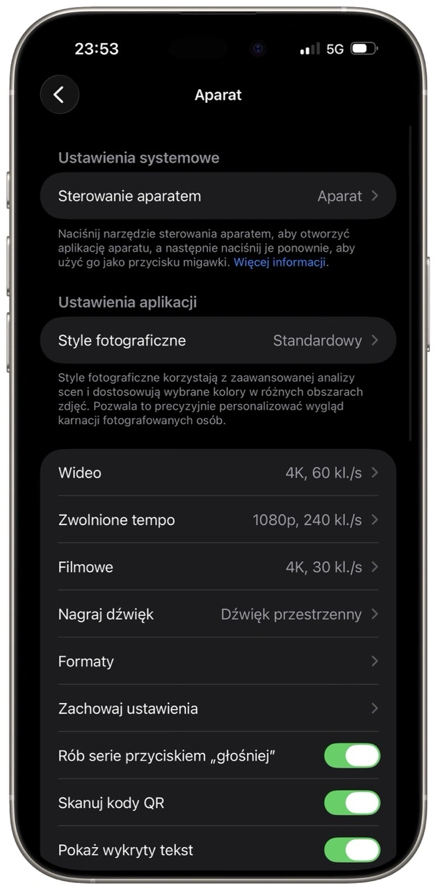 W sekcji Ustawienia | Aparat można znaleźć masę przydatnych opcji konfiguracji. Dobrym pomysłem jest zmiana rozdzielczości rejestrowanego wideo z na HD, aby nie zapchać pamięci urządzenia od razu po nakręceniu kilku filmów. W dowolnym momencie, gdy uznamy, że warto to zrobić, możemy przełączyć nagrywanie na 4K już bez wchodzenia w ustawienia z poziomu apki aparat. Oprócz tego można tutaj od razu zmienić domyślny Styl Fotograficzny na inny oraz włączyć siatkę w wizjerze aparatu, a nawet… zmienić ogniskową tego głównego obiektywu.