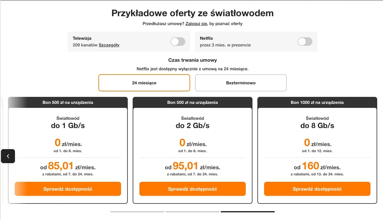 - wariant 2 Gb/s - pół roku abonamentu za 0 zł oraz 500 zł na elektronikę;