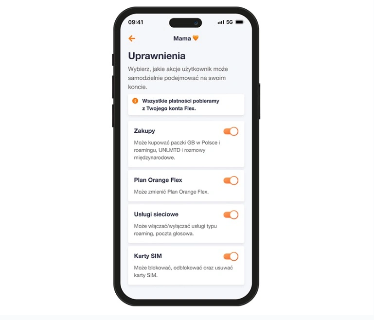 Druga sprawa to, że zarządzający dodatkowymi numerami mają większą kontrolę nad uprawnieniami innych kont. Można zaznaczyć, czy osoba z rodziny będzie w stanie samodzielnie kupować paczki GB w Polsce i roamingu, pakiety nielimitowane czy rozmowy międzynarodowe. Jest też możliwość pozwolenia zmiany planu Orange Flex, czy zarządzania kartami SIM: usuwania, blokowania, odblokowywania oraz wyłączania lub włączania innych usług sieciowych.