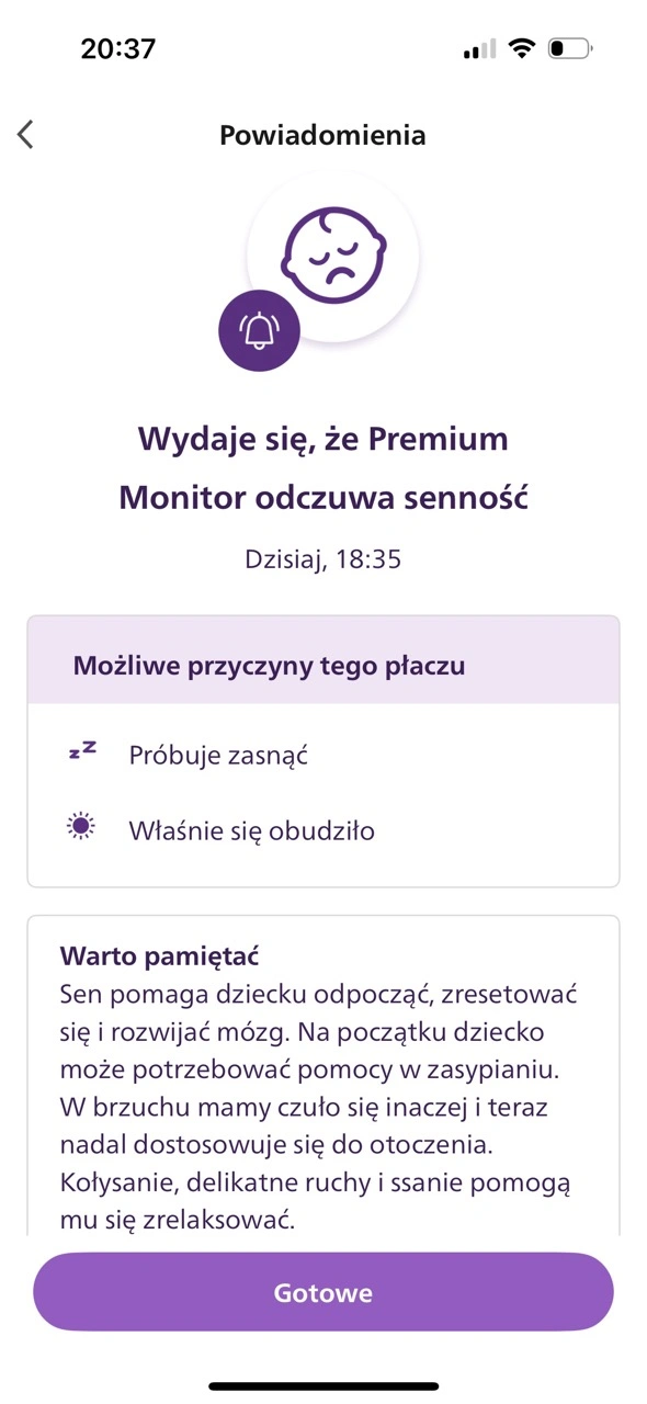 Drugą funkcją, która wyraźnie odróżnia to urządzenie od większości rywali, jest rozpoznawanie przyczyny płaczu. System powstał we współpracy z firmą Zoundream i wykorzystuje algorytmy analizujące dźwięk. Niania najpierw wychwytuje, że dziecko płacze, a następnie interpretuje, z czego ten płacz wynika. Może to być głód, rozdrażnienie, senność, dyskomfort albo ból brzuszka. Po krótkiej chwili na ekranie odbiornika i w aplikacji pojawia się powiadomienie z interpretacją. To wskazówka, a nie diagnoza - ale przy pierwszym dziecku, gdy rodzice dopiero się wszystkiego uczą, bywa pomocna i pozwala przygotować się, idąc do pokoju dziecka.
