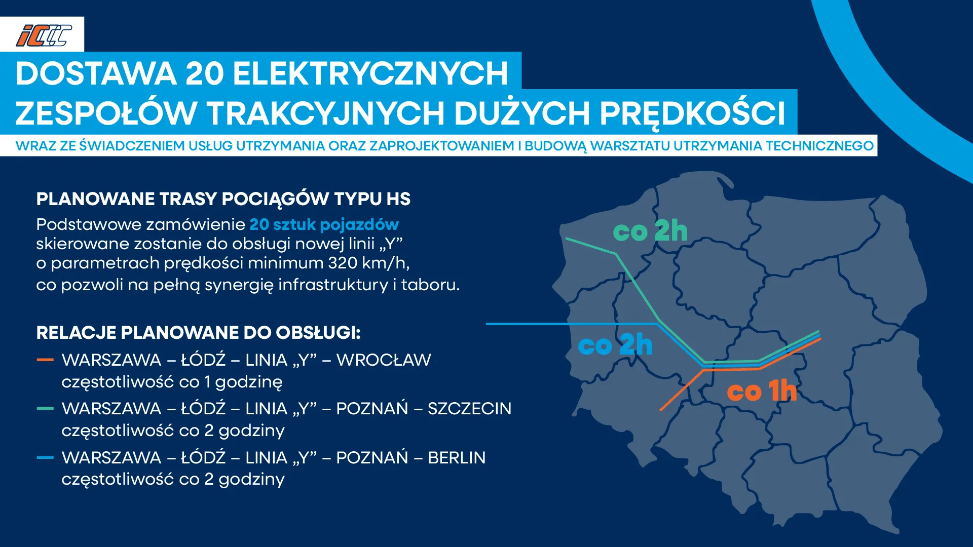 Nowe składy będą obsługiwać przede wszystkim linię "Y", czyli trasę Warszawa-Port Polska-Łódź-Poznań/Wrocław. Najpierw jednak spotkamy je w relacji Warszawa-Łódź, co jest logiczne: odcinek KDP Warszawa – Łódź ma zostać uruchomiony w 2032 r., równocześnie z oddaniem do użytku lotniska. Natomiast fragment z Łodzi przez Sieradz do Wrocławia i Poznania powinien zostać dopuszczony do użytkowania do końca 2035 r.