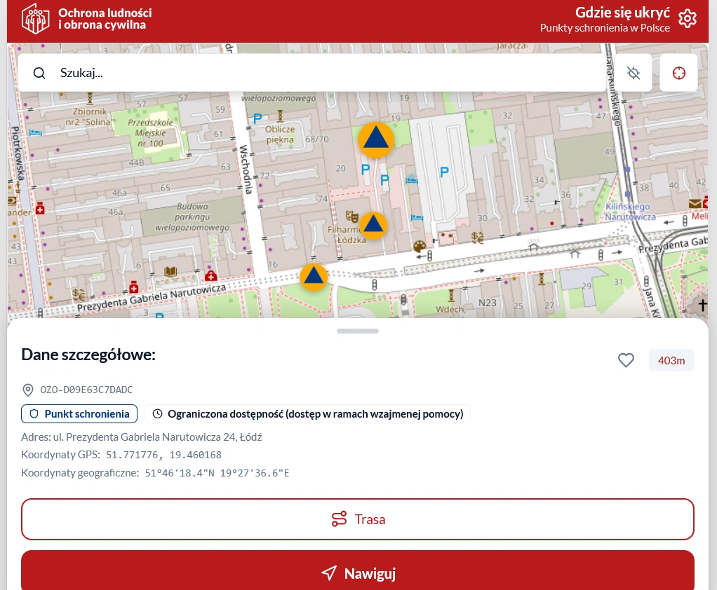 Szwankuje także wyszukiwanie. Nie da się odszukać konkretnego miejsca, np. Placu Wolności. Nie działa też wyszukiwanie po kodach pocztowych. Nie wiem, czy mapa nie znajduje np. Zduńskiej Woli, bo nie ma w niej żadnych punktów schronienia, czy po prostu nie widzi miasta.