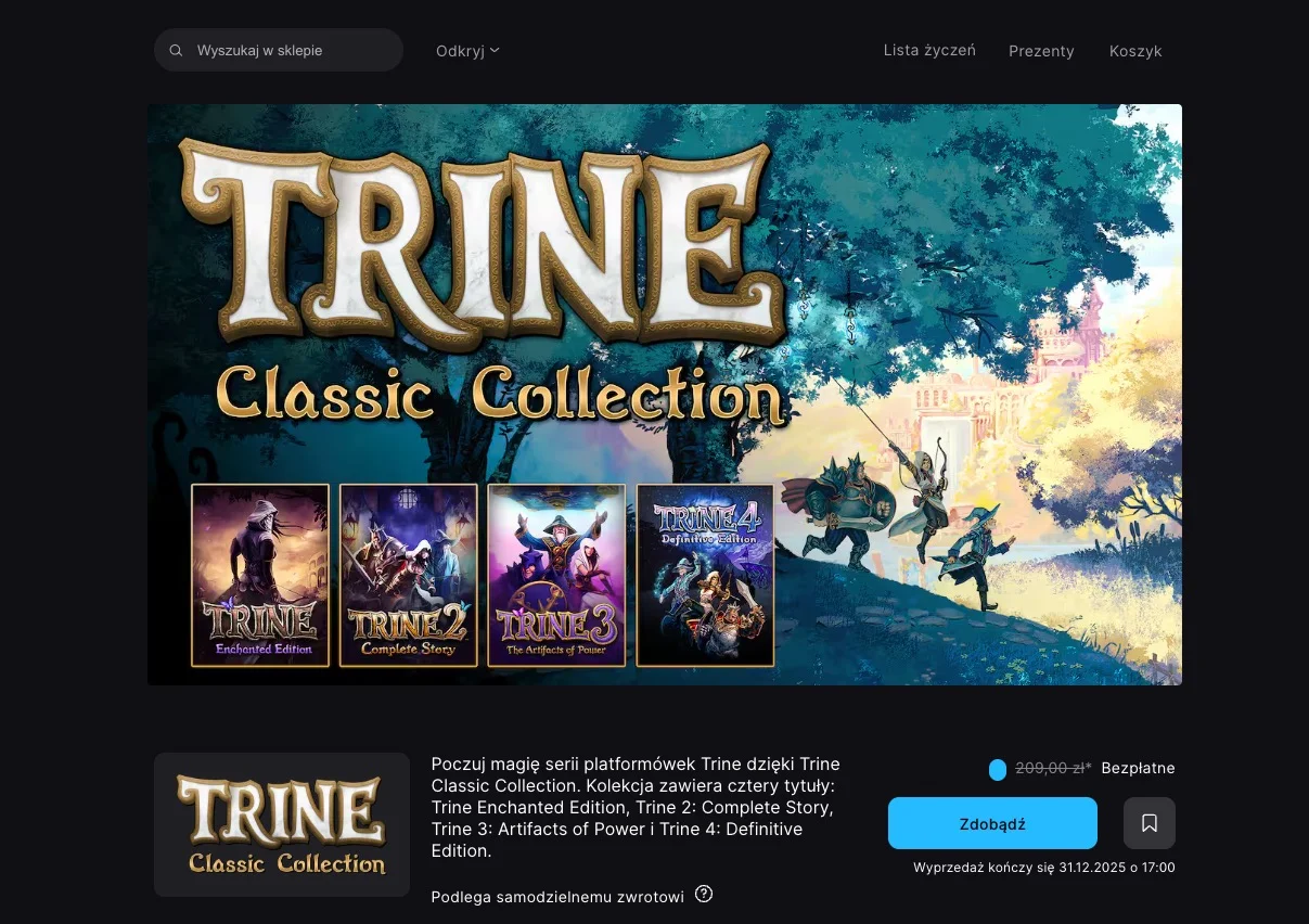Niestety, ale sklep nie zapewnia dostępu do całej serii Trine. W 2023 r. wydano też piątą część Trine 5: A Clockwork Conspiracy. To obecnie kosztuje ok. 50 zł w promocjach.
