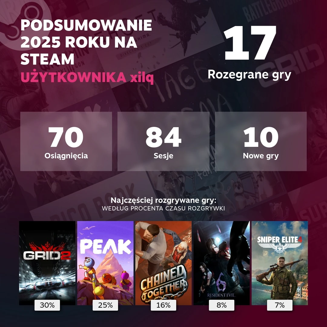 W podsumowaniu zobaczysz pięć najczęściej uruchamianych gier wraz z ich procentowym udziałem. Steam pokazuje też, ile tytułów uruchomiłeś w tym roku, w tym nowych, oraz jak ten wynik wypada na tle poprzedniego roku. Do tego dochodzą statystyki dotyczące osiągnięć oraz najdłuższej serii grania, czyli liczby dni, przez które uruchamiałeś grę bez przerwy.