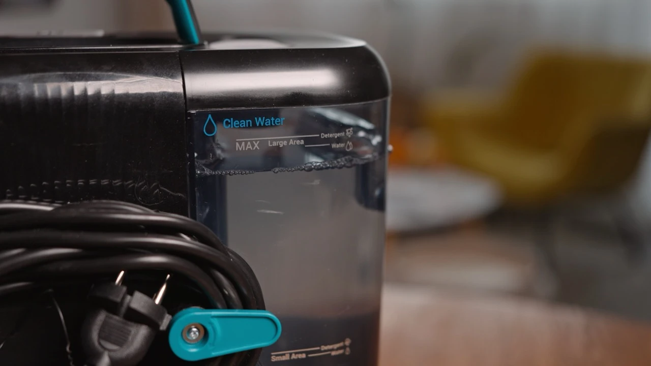 Nowy odkurzacz piorący w ofercie marki Tefal wyposażono w spory pojemnik na wodę, do której dolewamy detergent. Dzięki temu, że ścianki są przezroczyste, od razu widać, czy Clean It jest gotowy do pracy, czy też trzeba uzupełnić płyny. Na obudowie znalazły się podziałki, które wskazują, ile trzeba dolać wody, a ile dołączonego do zestawu płynu - nie musimy używać miarki ani robić tego „na oko”.